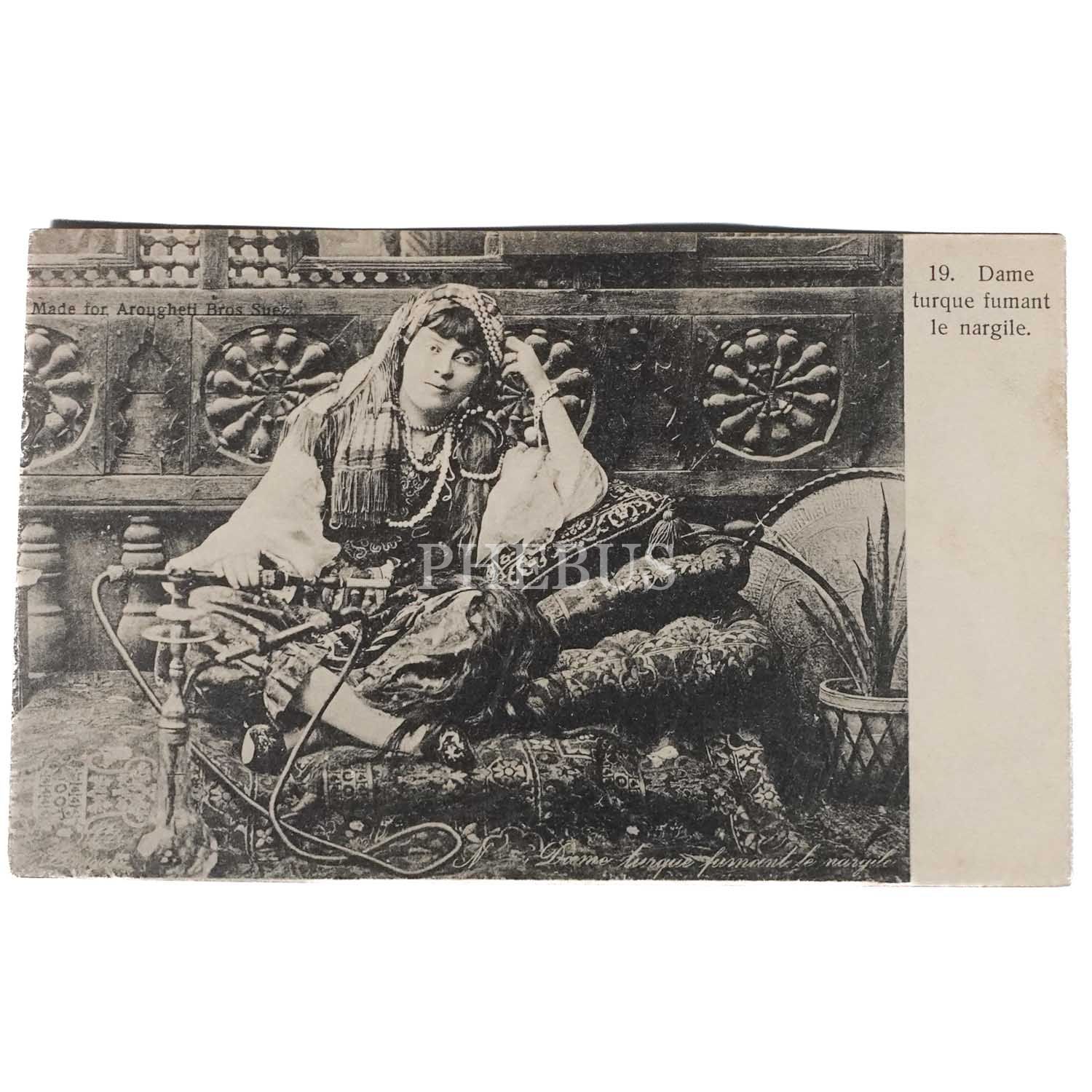 Elinde nargilesiyle bir Türk kadını, "Dame turque fumant le nargile", ed. Arougheti Bros Suez, 14x9 cm...
