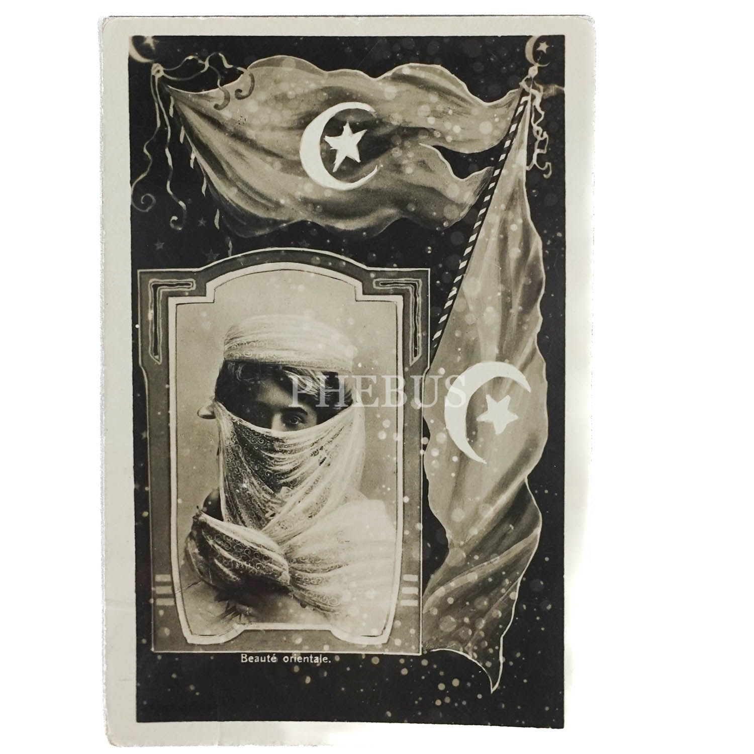 Türk bayrakları içinde güzel bir kadın görselli fantazi kartpostal, "Beaute orientale", 9x14 cm...