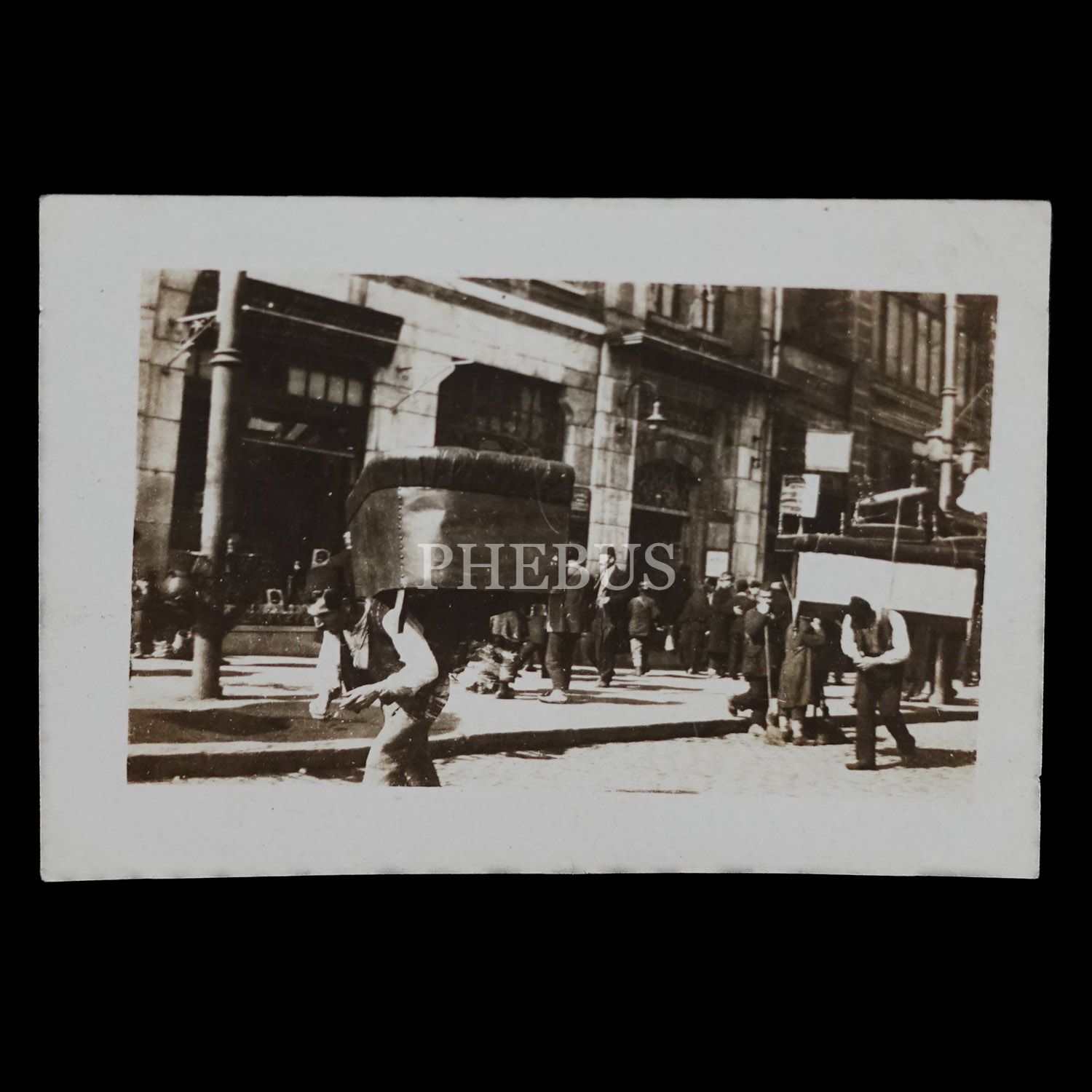 Osmanlı döneminden, İstanbul´un merkezi bir noktasında yük taşıyan hamallar ve kozmopolit kalabalık görünümü, 7x5 cm...