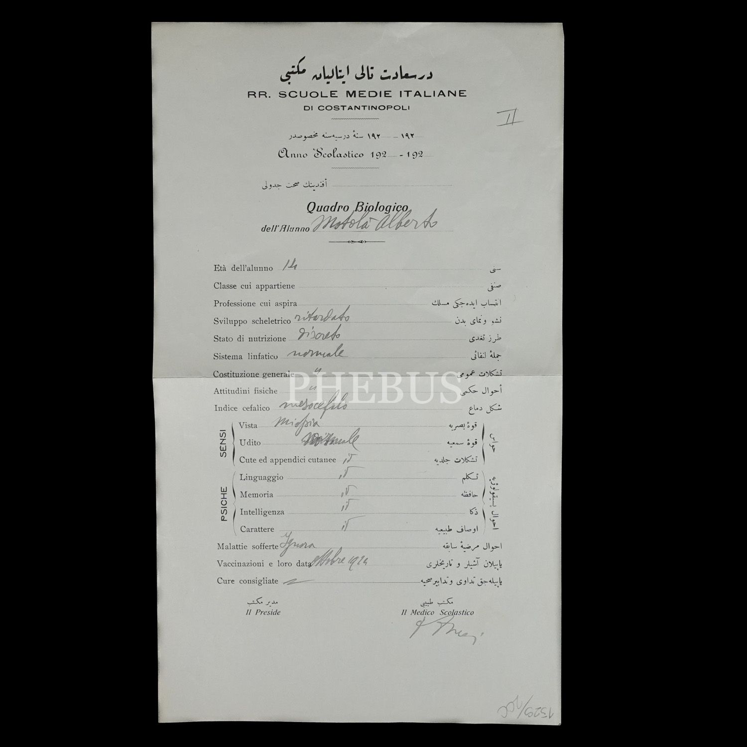 İstanbul İtalyan Mektebi tarafından Matola Alberta adına düzenlenmiş iki dilde (Osmanlıca ve İtalyanca) sağlık raporu, 19x33 cm...