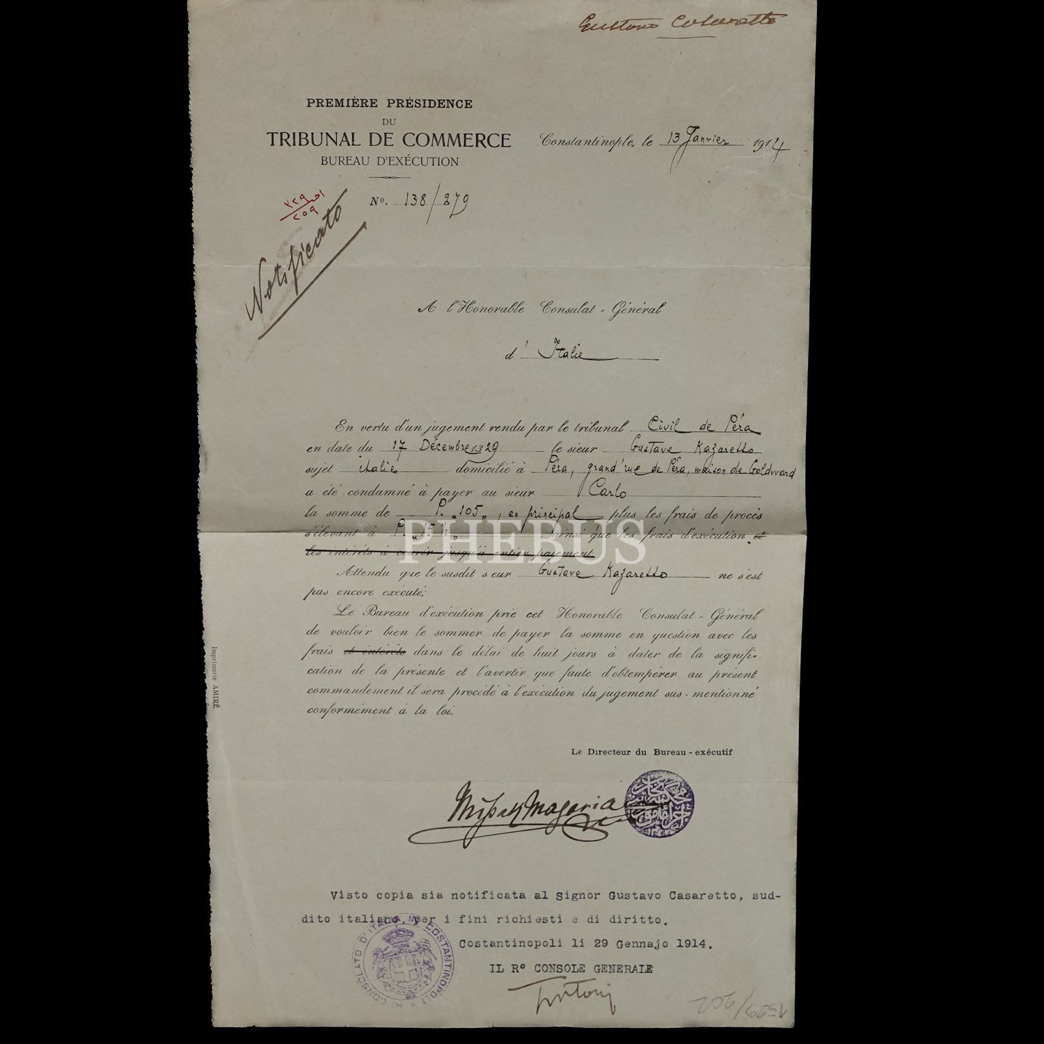 İtalya Başkonsolosluğu´na gönderilmiş "Ticaret Mahkemesi İcra Ofisi" (Constantinople) antetli, 1914 tarihli belge, 20x35 cm...