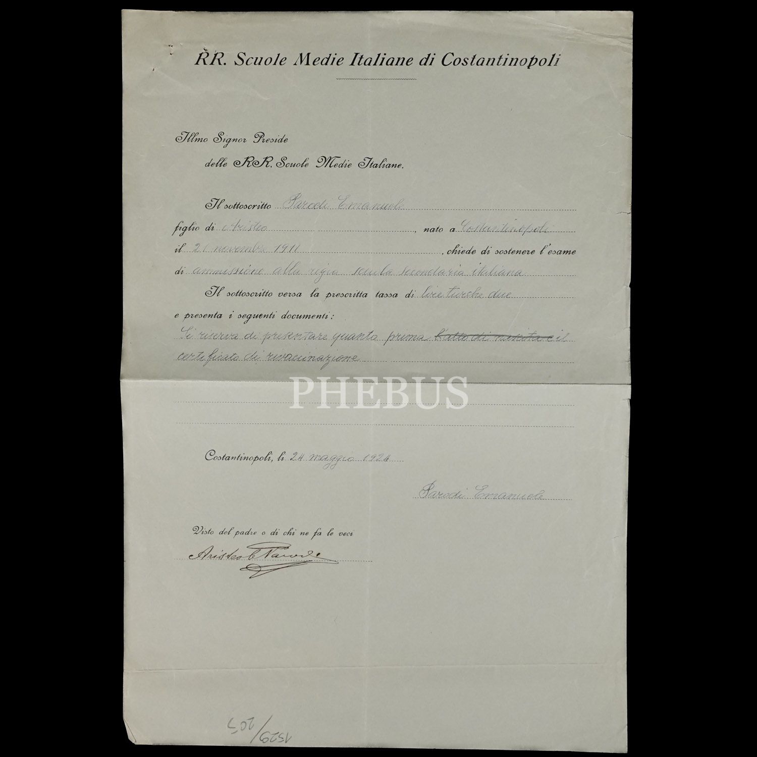 Bir öğrencinin, Konstantinopolis İtalyan Ortaokulları´ndan birine giriş sınavı için doldurduğu belge, 24 Mayıs 1924, 23x33 cm...