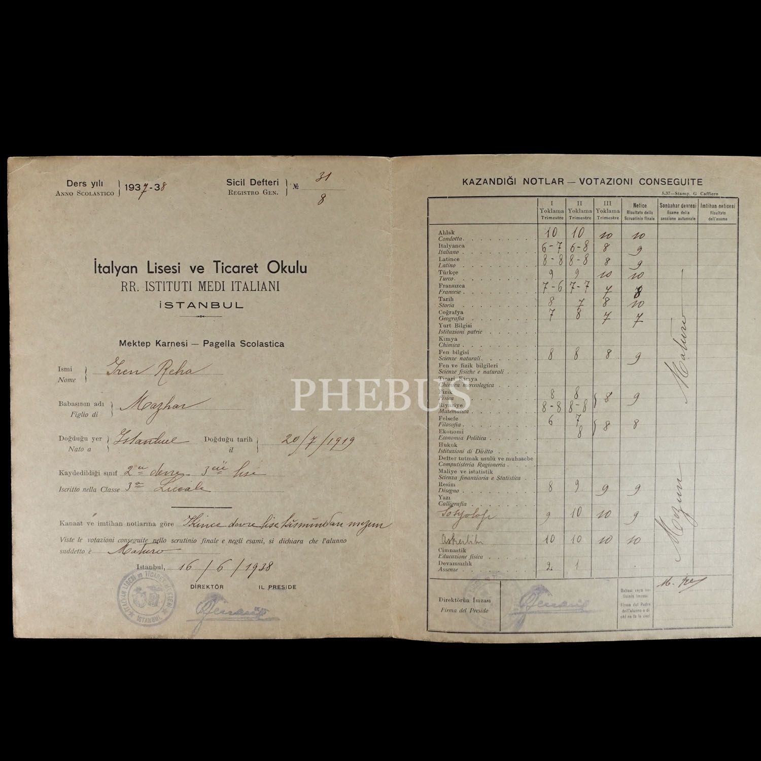 İtalyan Lisesi ve Ticaret Okulu Mektep Karnesi, 1937-1938, 20x25 cm...