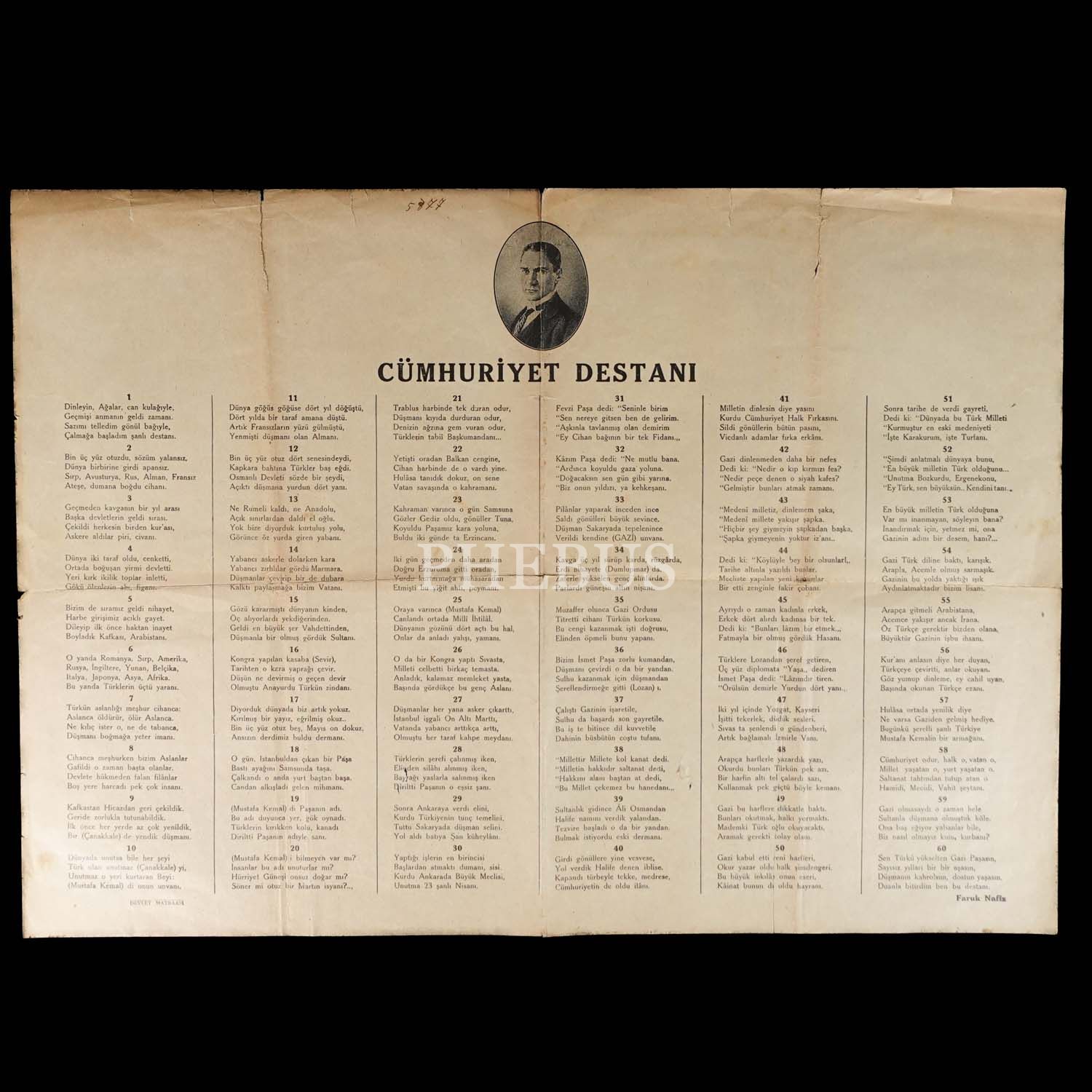 Faruk Nazif Çamlıbel tarafından kaleme alınan "Cümhuriyet Destanı"nın, Mustafa Kemal Atatürk görselli afiş baskısı, Devlet Matbaası, 57x41 cm...