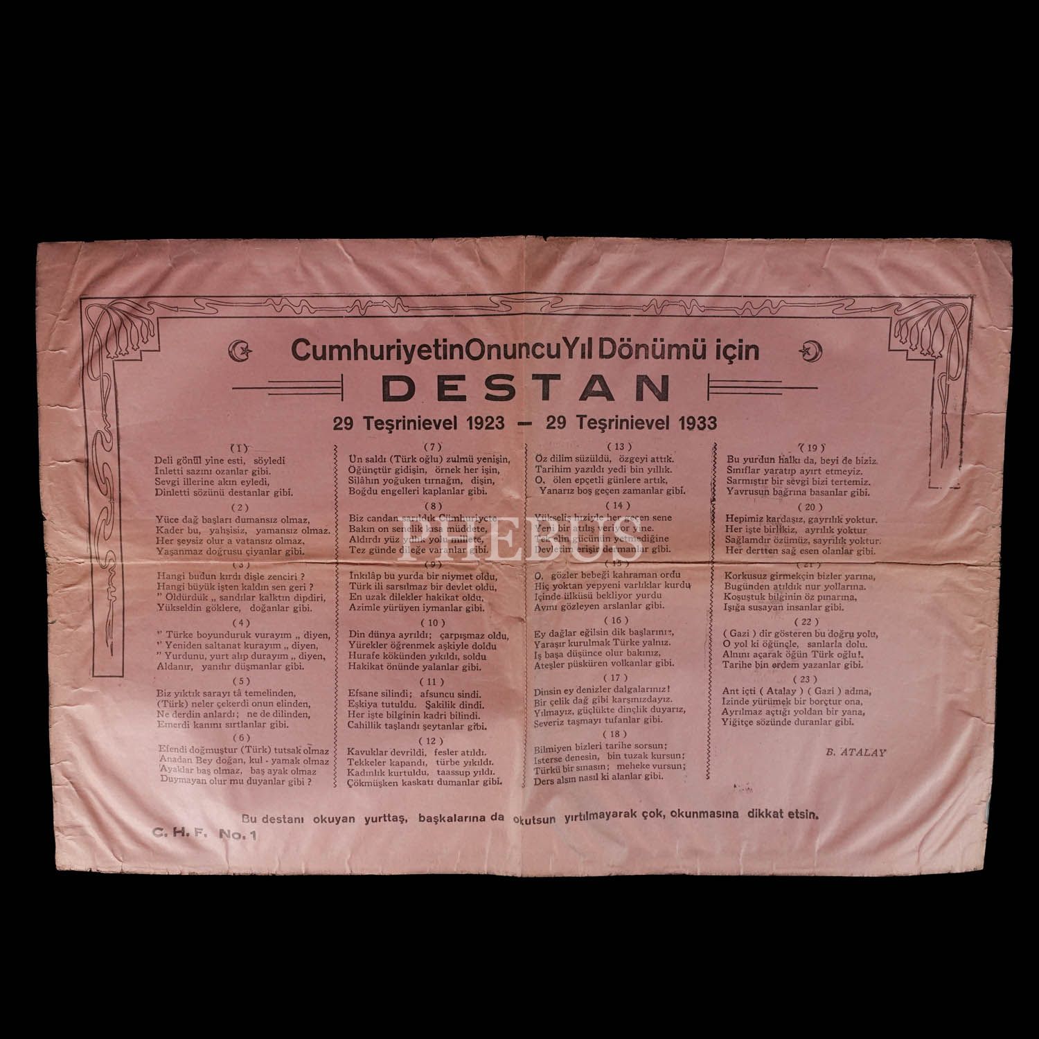 Besim Atalay tarafından kaleme alınan "Cumhuriyetin Onuncu Yıl Dönümü için Destan"ın, Cumhuriyet Halk Fırkası tarafından hazırlanan afiş baskısı, 47x32 cm...