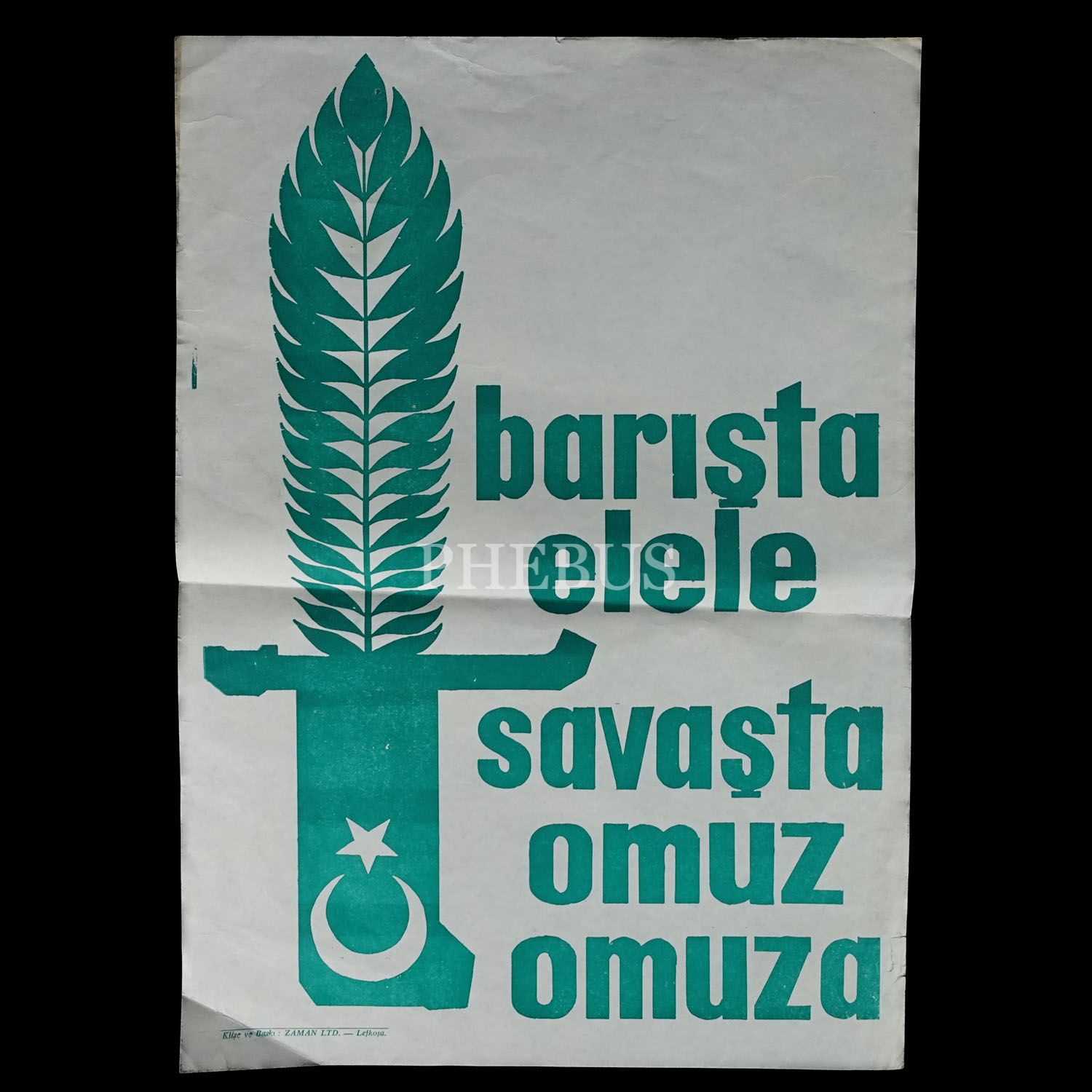 "Barışta Elele / Savaşta Omuz Omuza" yazılı, savaş ve barışı temsil eden motiflerle bezeli süngü görselli propaganda afişi, klişe ve baskı: Zaman Ltd. - Lefkoşa, 31x44 cm...