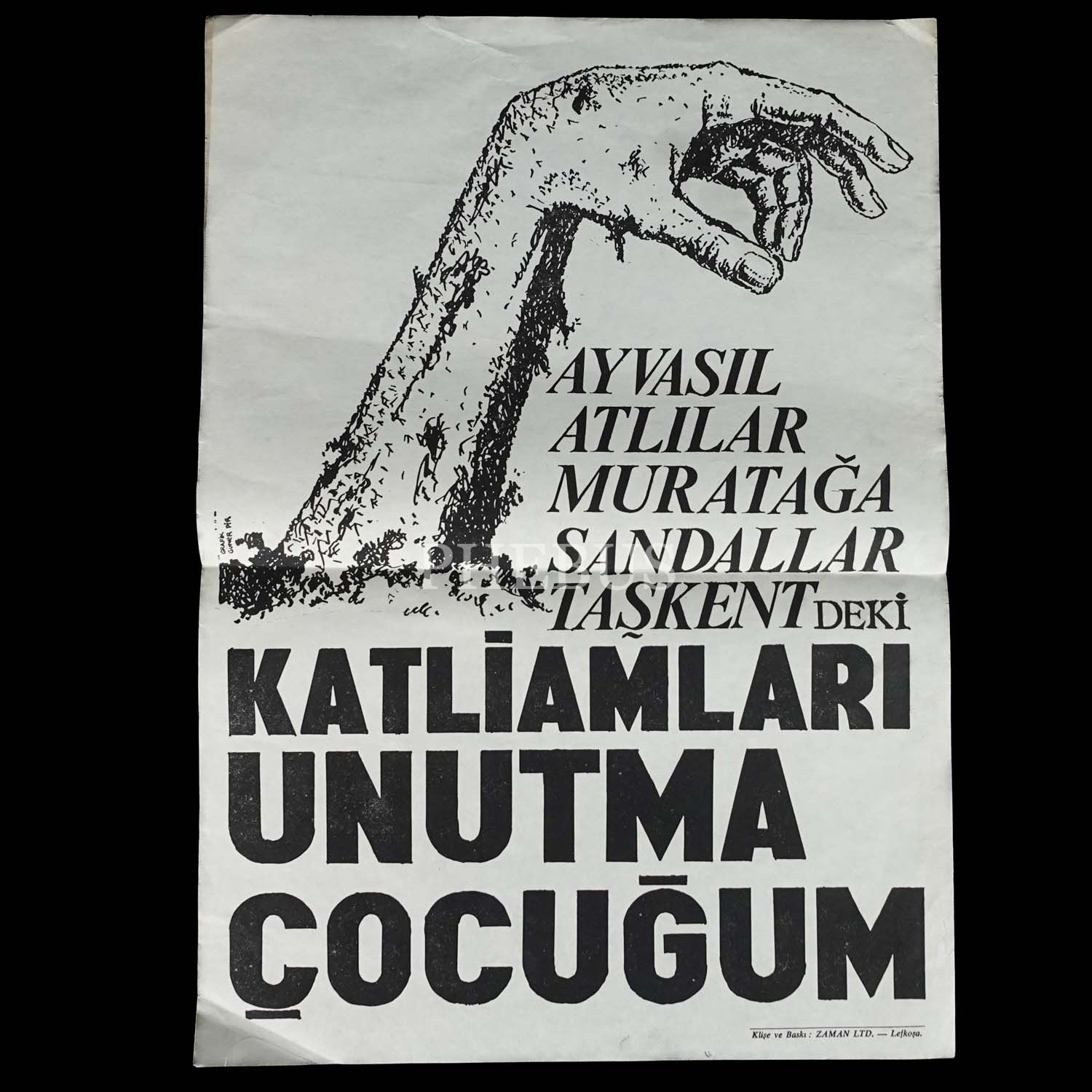 "Ayvasıl - Atlılar - Muratağa - Sandallar - Taşkent´deki Katliamları Unutma Çocuğum" yazılı ve mezalime uğrayan Türkleri temsil eden toprağa gömülü el görselli propaganda afişi, grafiker: Güner Pir, klişe ve baskı: Zaman Ltd. - Lefkoşa, 31x44 cm...