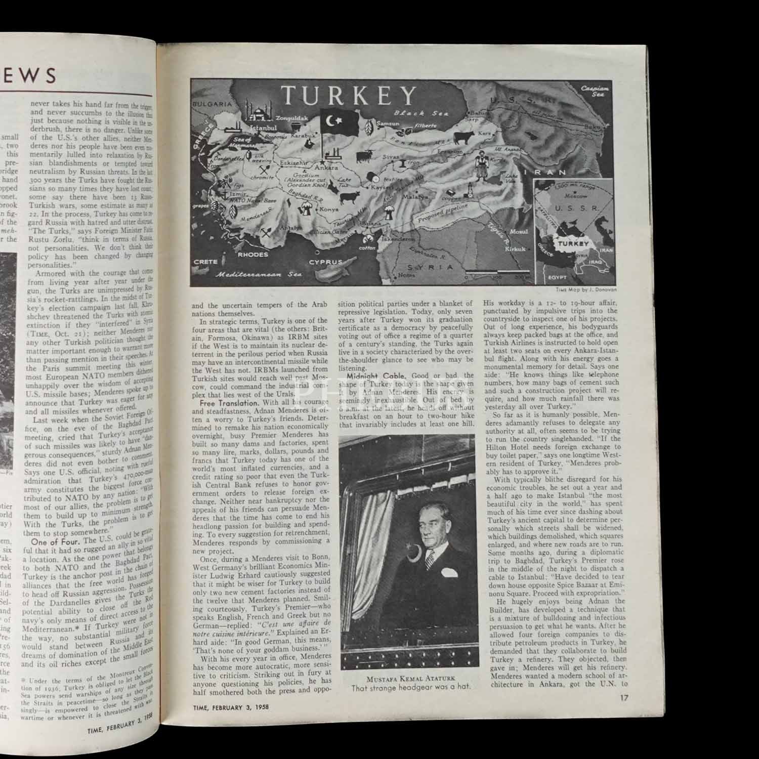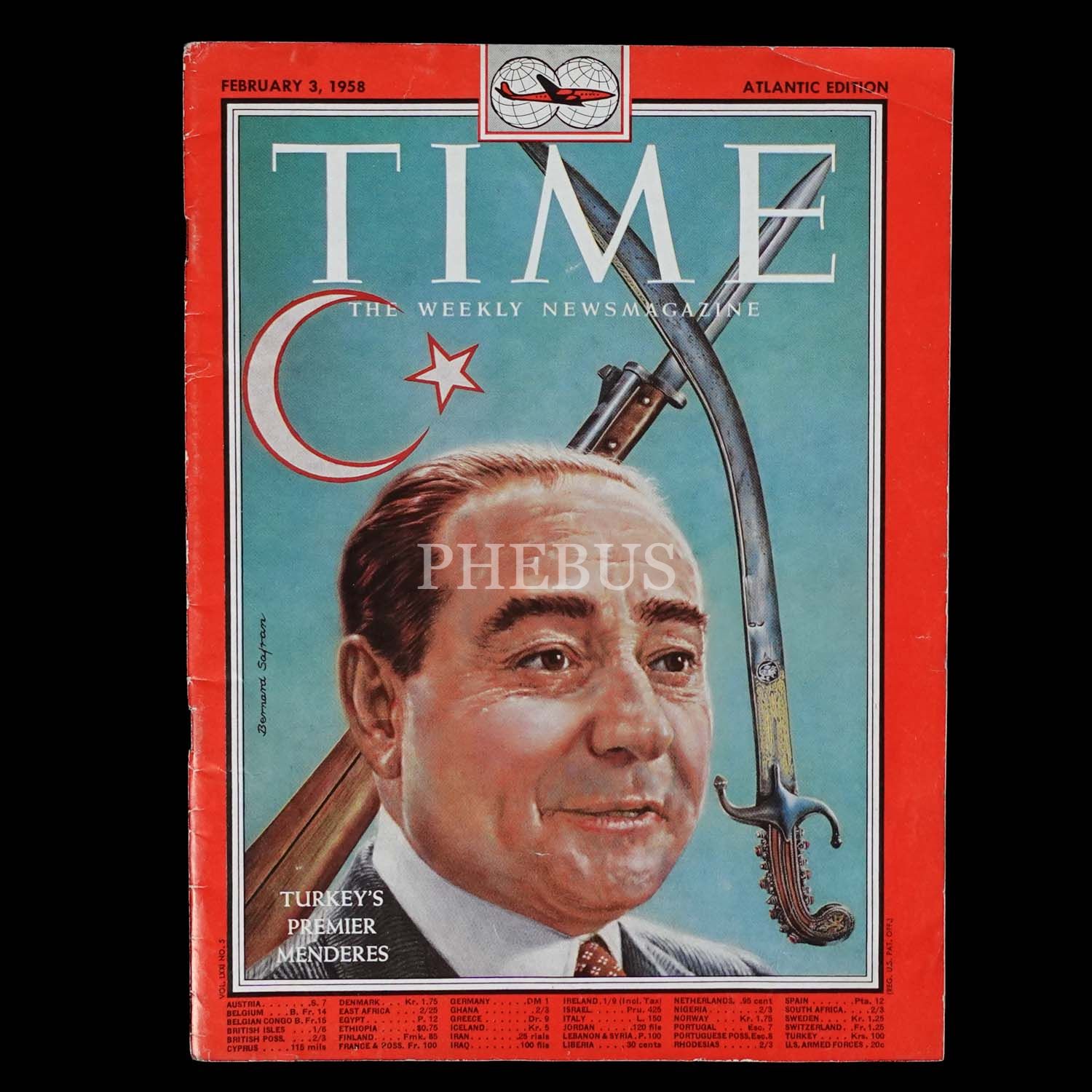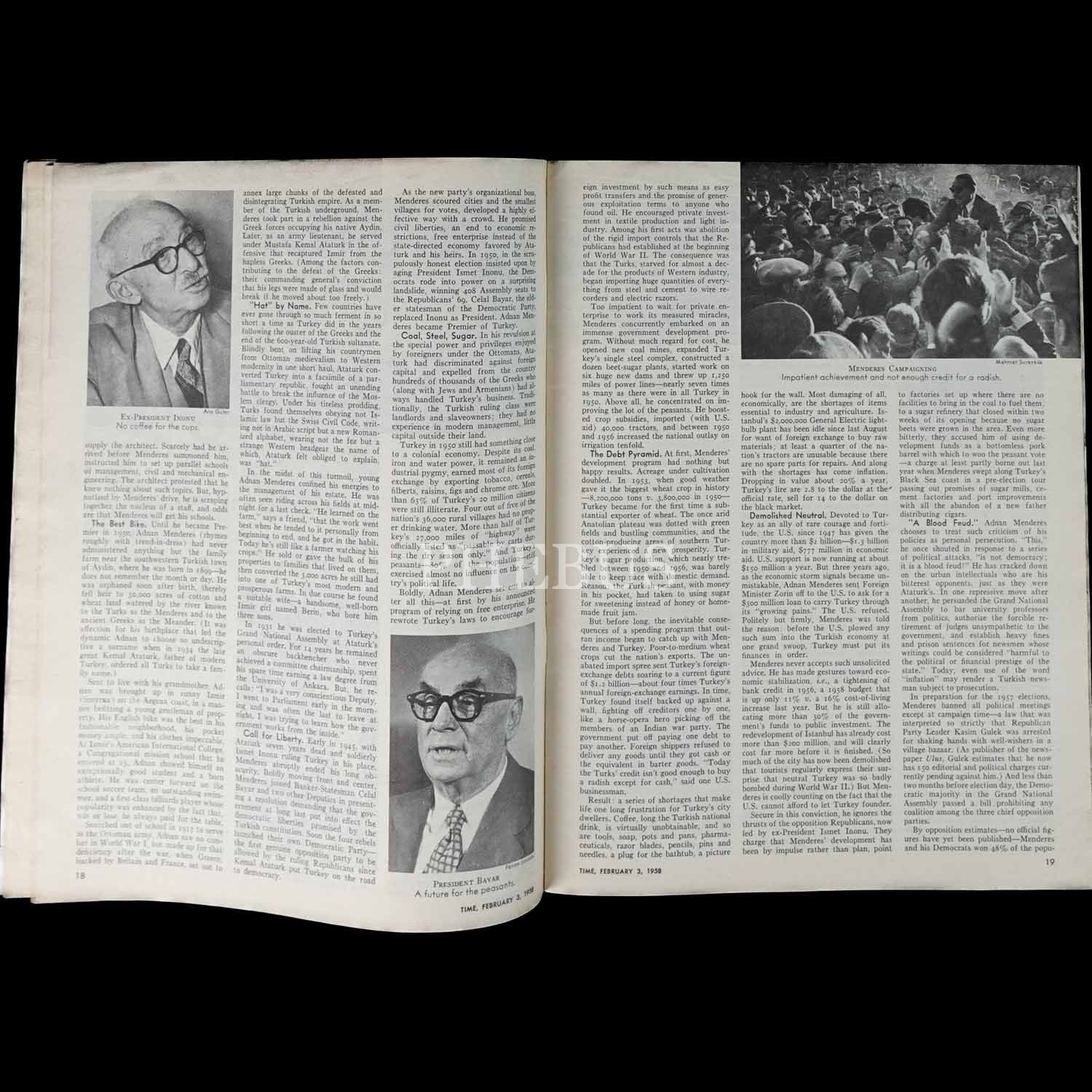 "Turkey´s Premier Menderes" başlığıyla, Başbakan Adnan Menderes´i kapağına taşıyan TIME dergisi, 3 Şubat 1953, 64 sayfa, 21x28 cm...