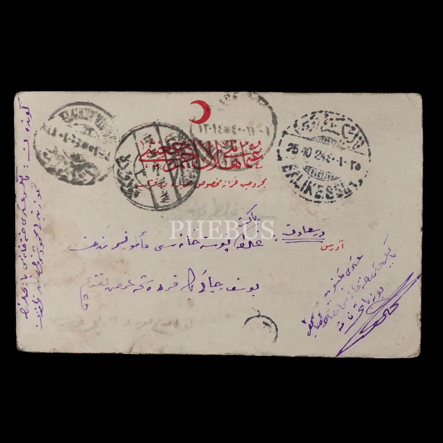 Balıkesir Askeri Hastahanesi yazıcılarından Göztepeli Mahmud Şevki Efendi´nin Galata Postahanesi Memuru Yusuf Efendi´ye gönderdiği Hilal-i Ahmer antetli mektup kartı, 14x9 cm...