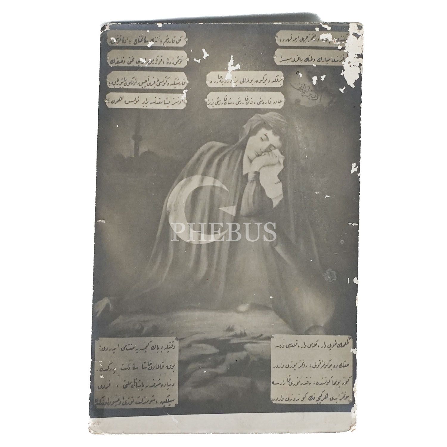 Türk bayrağına sarılı kederli bir Türk kadını görselli ve "İzmir Limanı" ibareli, Millî Mücadele temalı şiirlerle bezeli mefkure kartı, 9x14 cm...