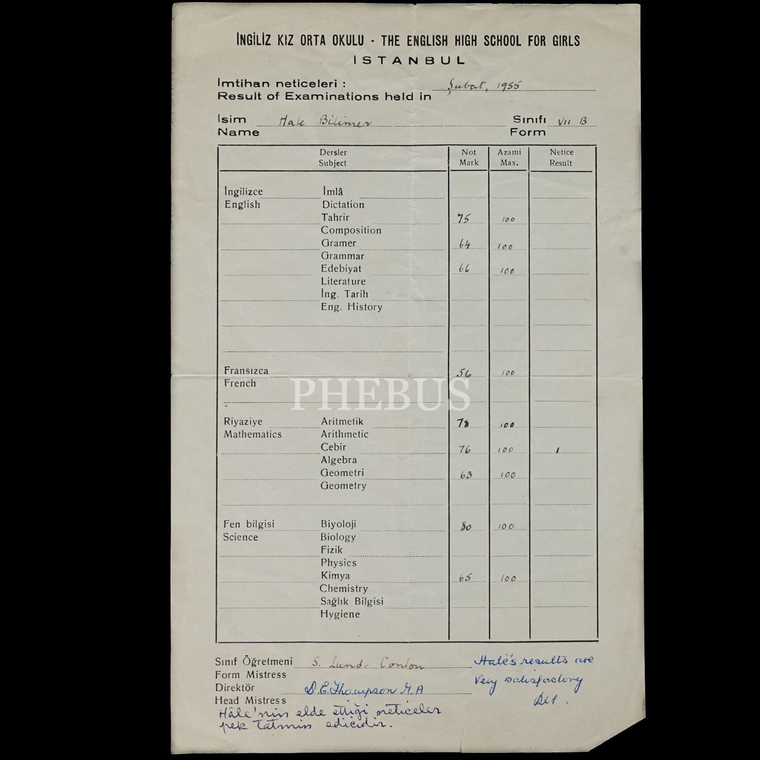 İstanbul İngiliz Kız Orta Okulu (The Engilsh High School for Girls) "İmtihan Neticeleri" belgesi, Şubat 1955, 17x26 cm...