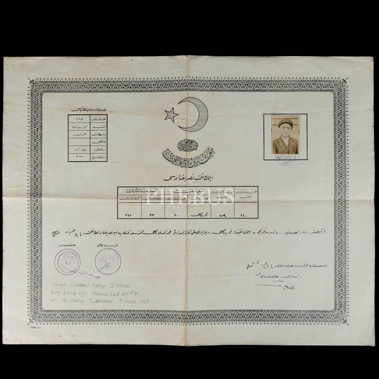 Üsküdar İhsaniye On Dokuzuncu İlk Mektebi´nden mezun olan Mehmed Esad Efendi´nin diploması, 1927, 45x34 cm...
