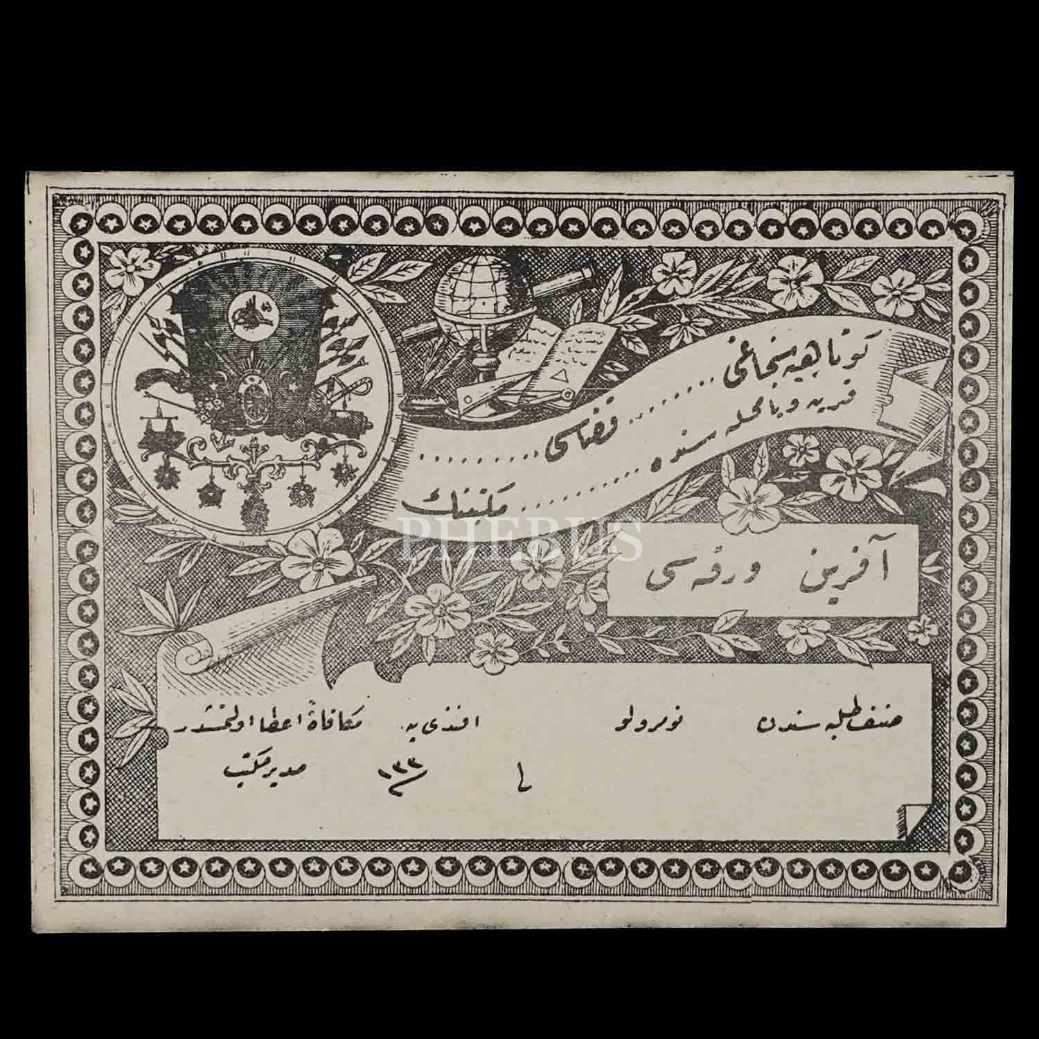 Osmanlı Devlet armalı, Kütahya´da bulunan okullar için hazırlanmış boş aferin kağıdı, 11x8 cm...