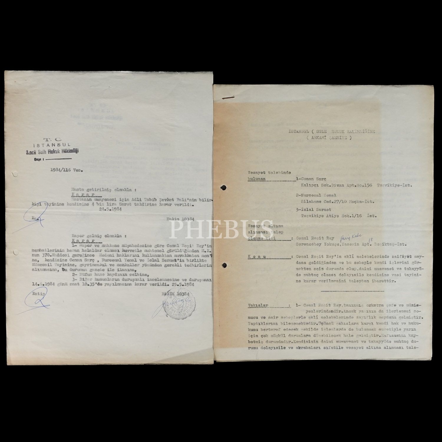 Akli melekelerinin zayıfladığı gerekçesiyle Cemal Reşit Rey´in akrabaları tarafından İstanbul Sulh Hakimliği´ne vasi tayini için yazılan dilekçe ve bu kararın onanması sonrası düzenlenen çeşitli belgeler, 1984, 4 parça, 23x29 cm...