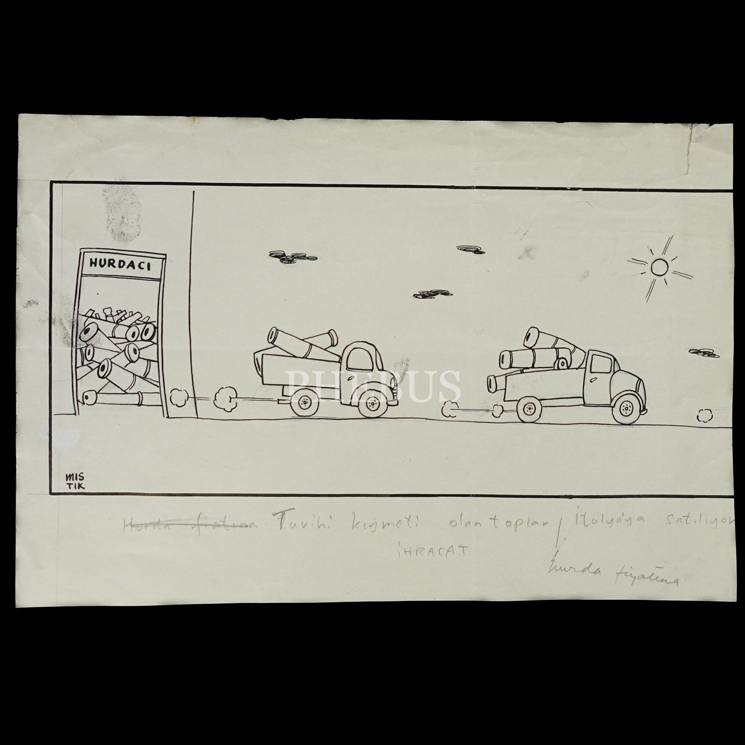 MISTIK (Mustafa Eremektar) ıslak imzalı, "Tarihi kıymeti olan toplar hurda fiyatına İtalya´ya satılıyor" açıklamalı karikatür, kâğıt üzeri çini mürekkebi, 28x19 cm...
