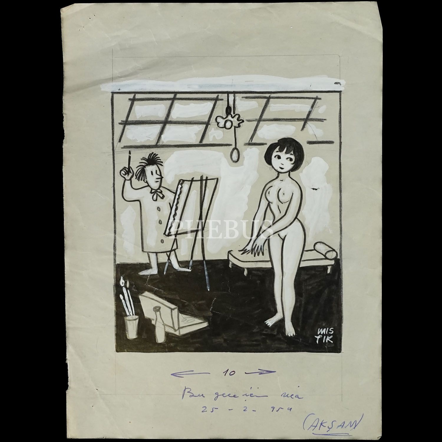 MISTIK (Mustafa Eremektar) ıslak imzalı, Akşam gazetesi için çizilmiş karikatür, 25 Şubat 1954, kâğıt üzeri çini mürekkebi, 20x27 cm...