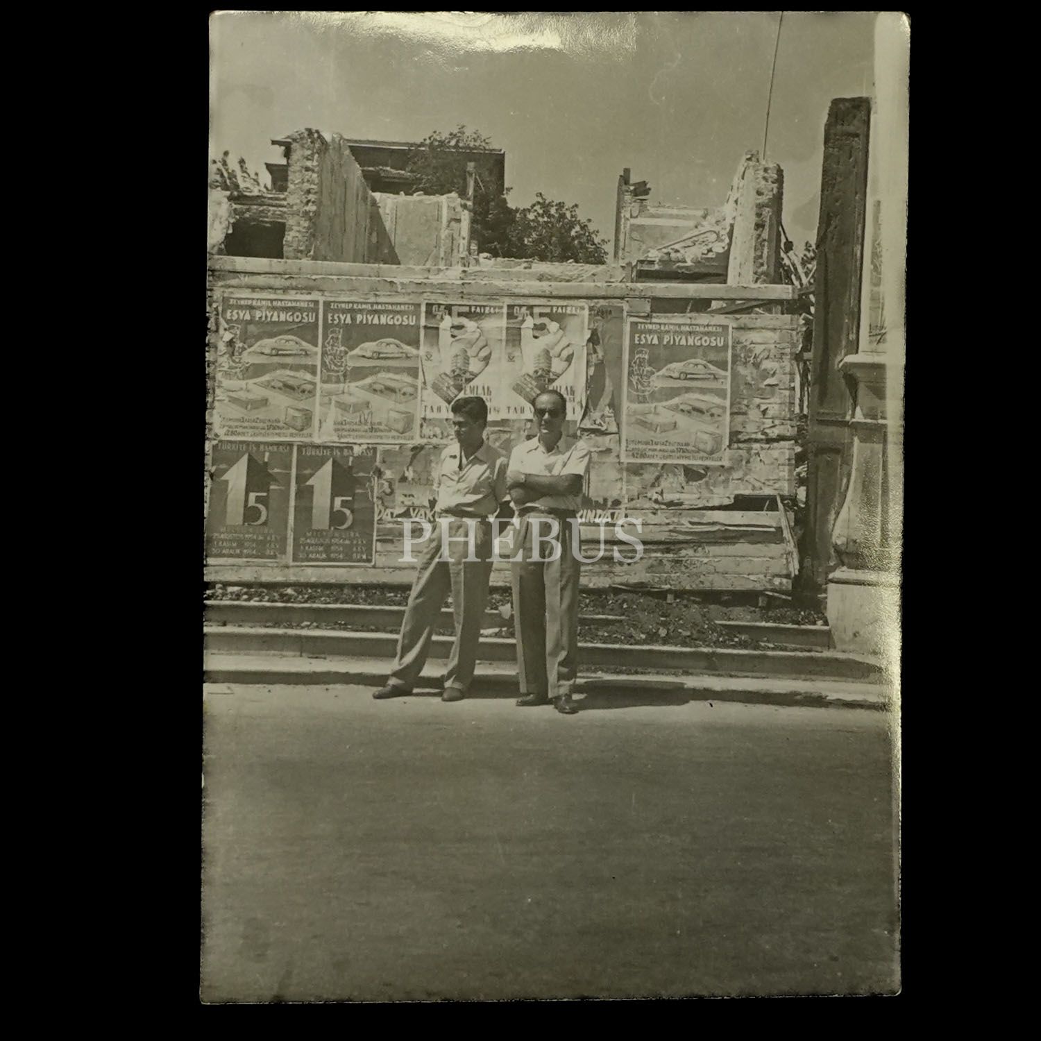 "Zeynep Kamil Hastahanesi Eşya Piyangosu", "Emlak Bankası Tahvilleri" ve "Türkiye İş Bankası 5 Milyon Lira" afişleri asılı bir duvar önünde iki arkadaş, 9 Eylül 1954, Tarabya, 8x11 cm...