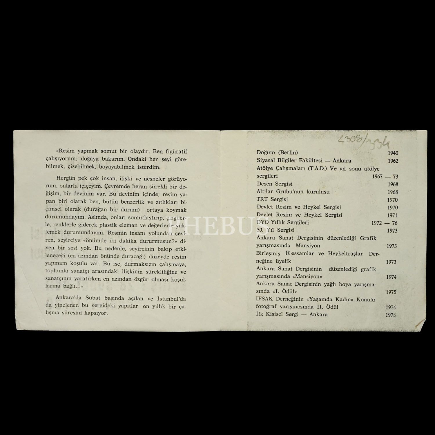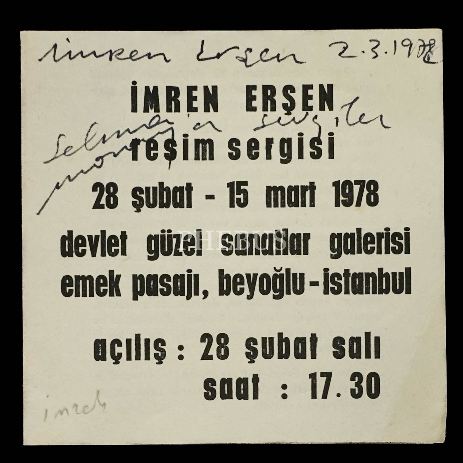 İmren Ersen´den ıslak imzalı resim sergisi davetiyesi, "İmren Erşen Resim Sergisi - 28 Şubat-15 Mart 1978 - Devlet Güzel Sanatlar Galerisi - Emek Pasajı, Beyoğlu", 12x12 cm...