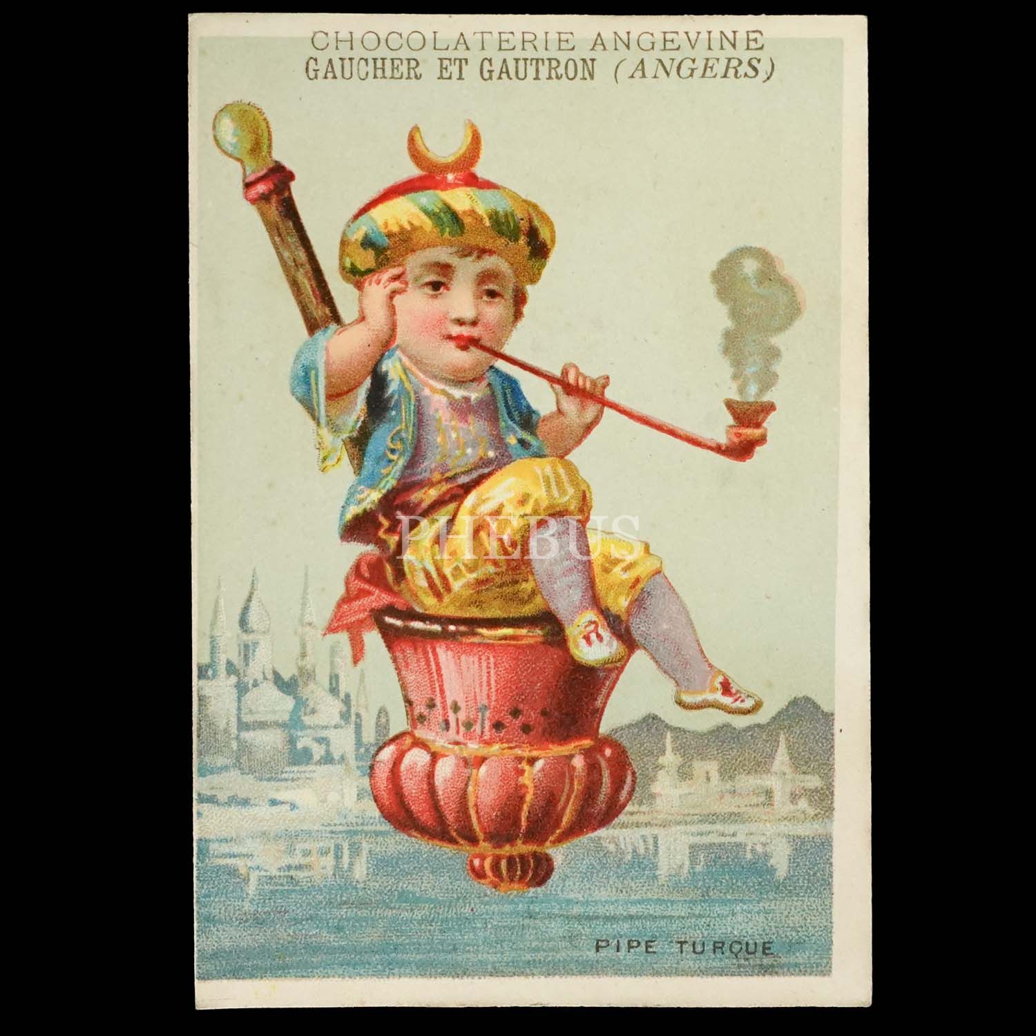 Sigara çubuklu Türk çocuğu görselli çikolata kartı, "Pipe Turque", Chocolaterie Angevine, 7,5x11 cm...