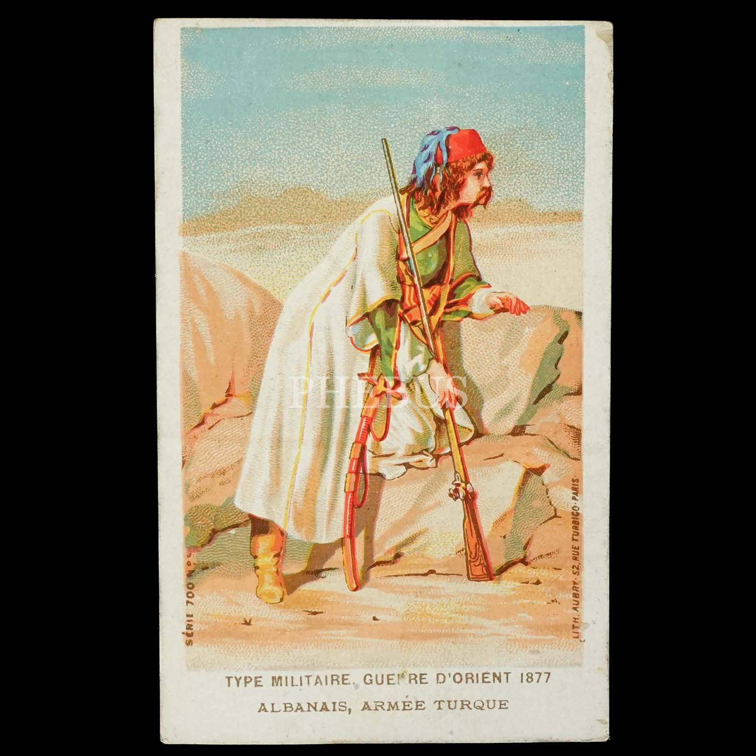 93 Harbi´nde Türk ordusunda görev alan bir Arnavut askeri görselli, giyim mağazası reklamlı kart, "Type Militaire, Guerre d´Orient 1877 - Albanais, Armee Turque", 7x11 cm...
