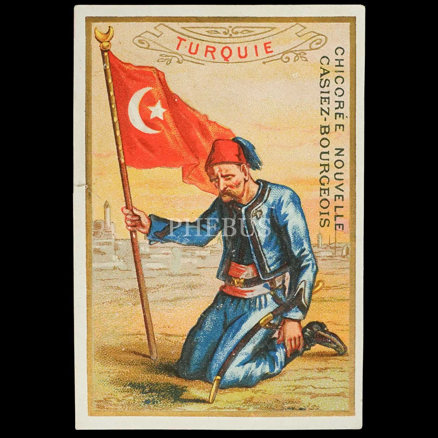 Elinde Türk bayrağıyla mahzun Türk askeri görselli, çay reklamlı gofre kart, "Turquie", 8x11 cm...