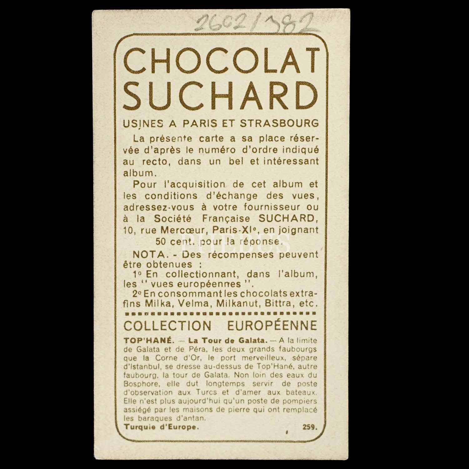 Galata Kulesi görselli çikolata kartı, "Turquie, Top´Hane - La Tour de Galata", Chocolats Suchard, 6x10 cm...
