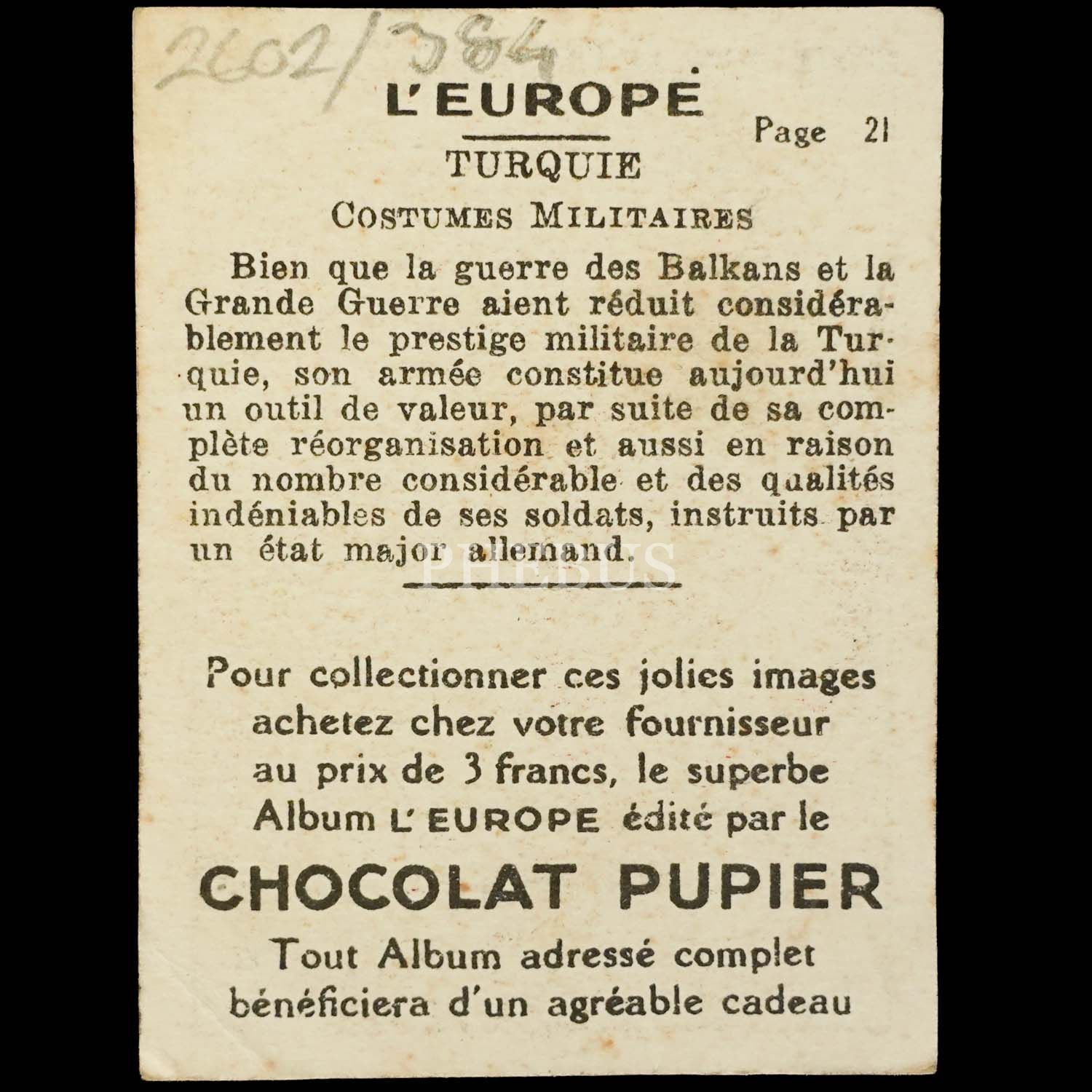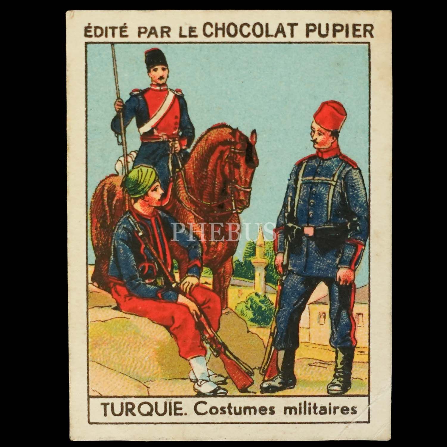Türk askerleri görselli çikolata kartı, "Turquie - Costumes militaires", Chocolat Pupier, 5x7 cm...
