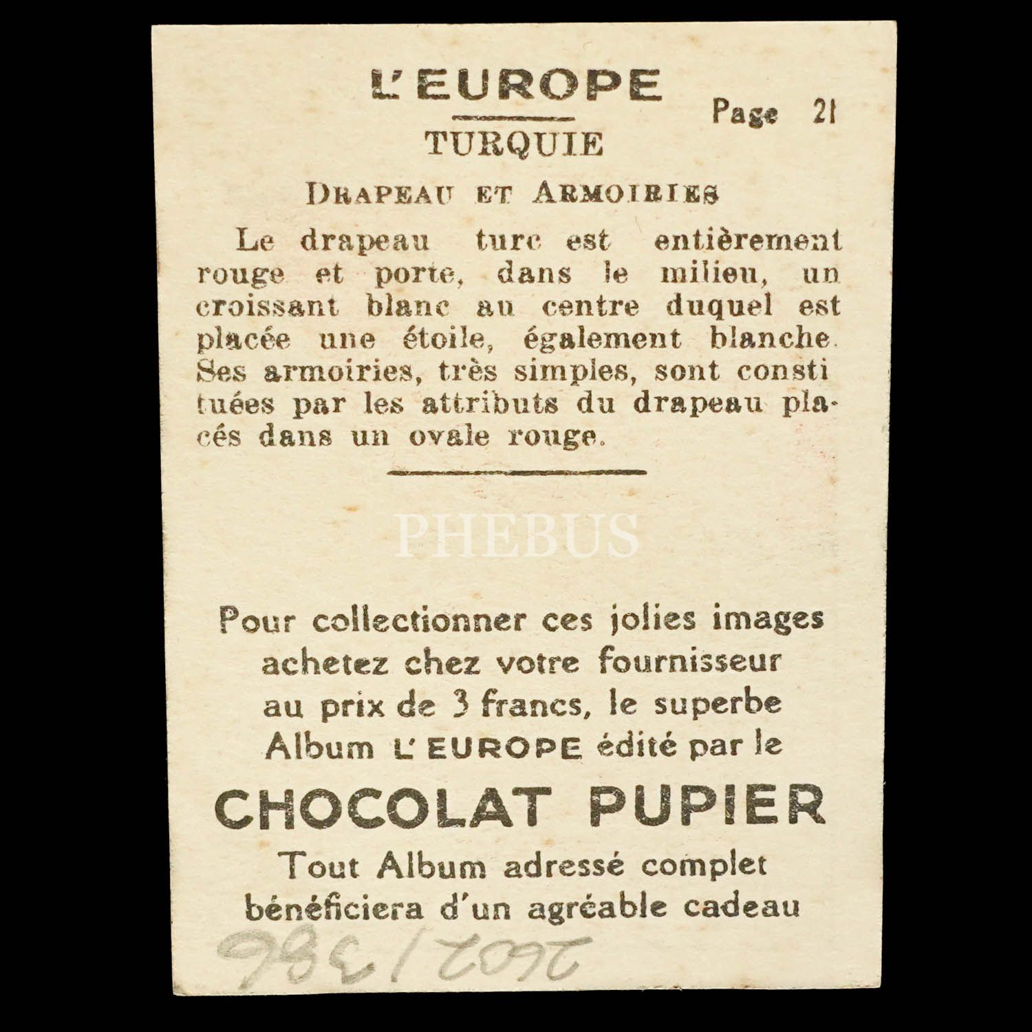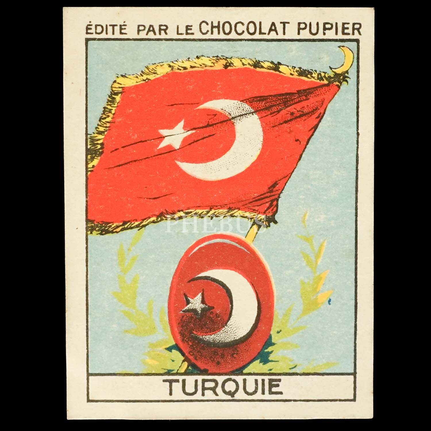 Türk bayrağı ve arması görselli çikolata kartı, "Turquie", Chocolat Pupier, 6x7 cm...