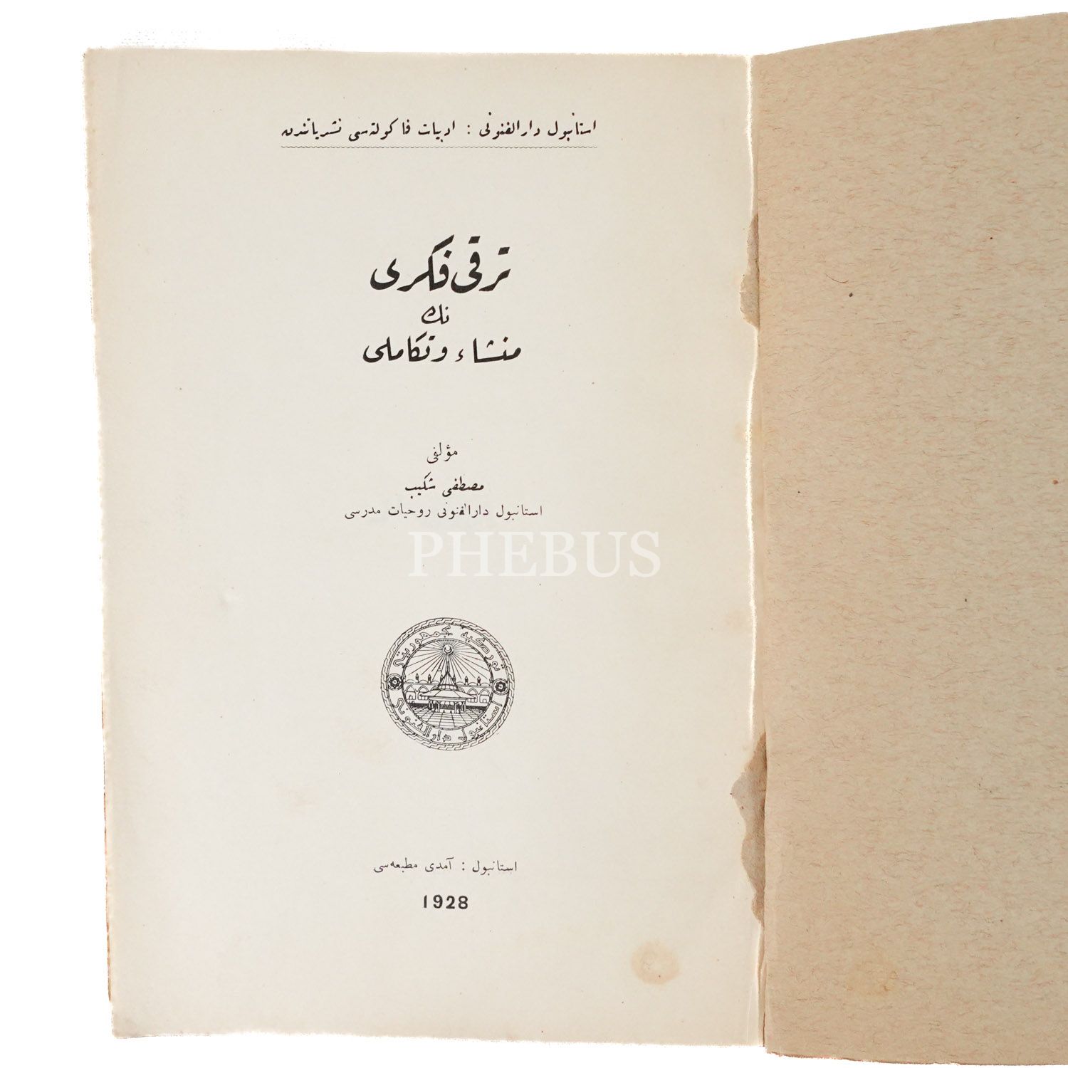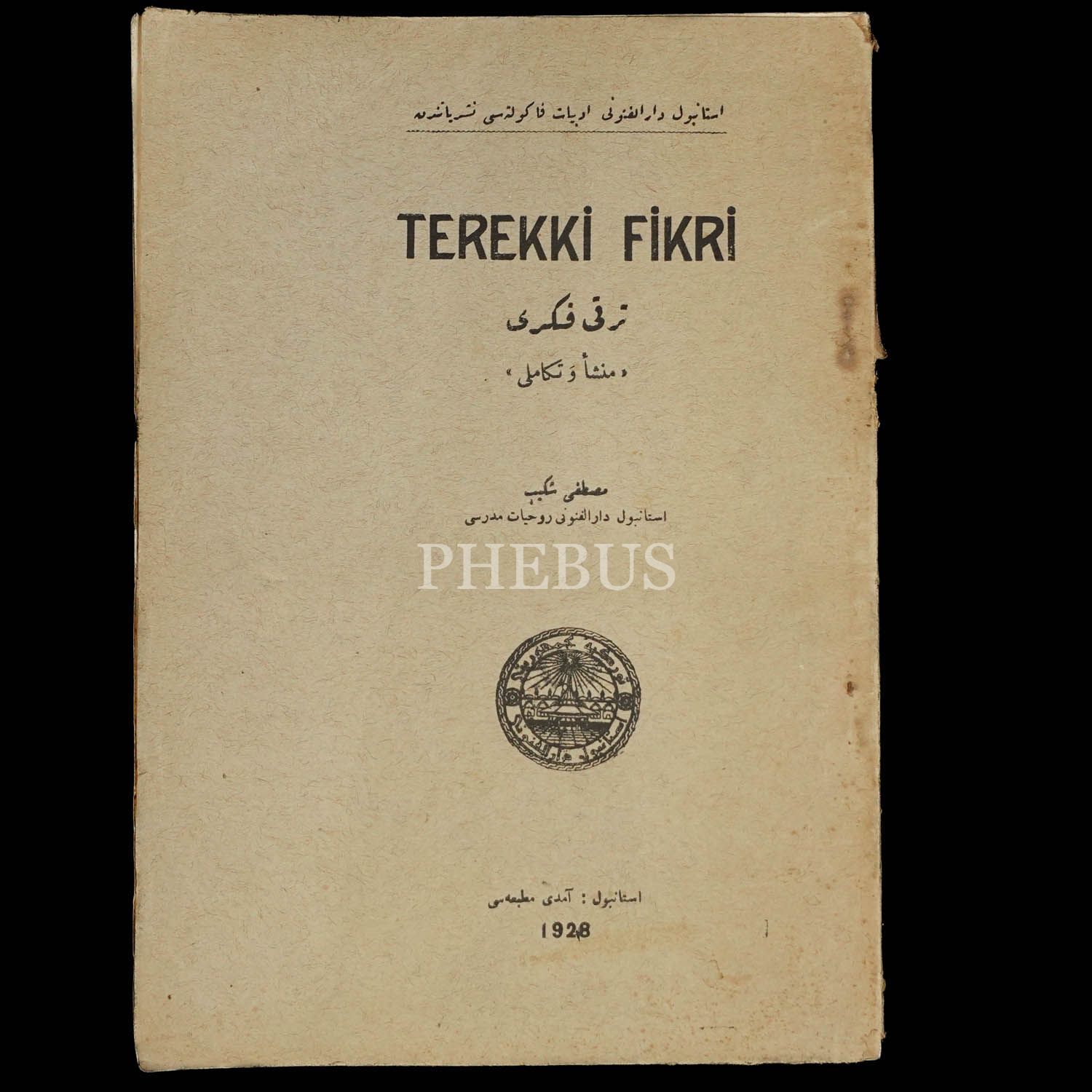 TEREKKİ FİKRİ, İstanbul Darülfünunu Ruhiyat Müderrisi Musyafa Şekib, 1928, Amedi Matbaası, 183 sayfa, 23x16 cm...