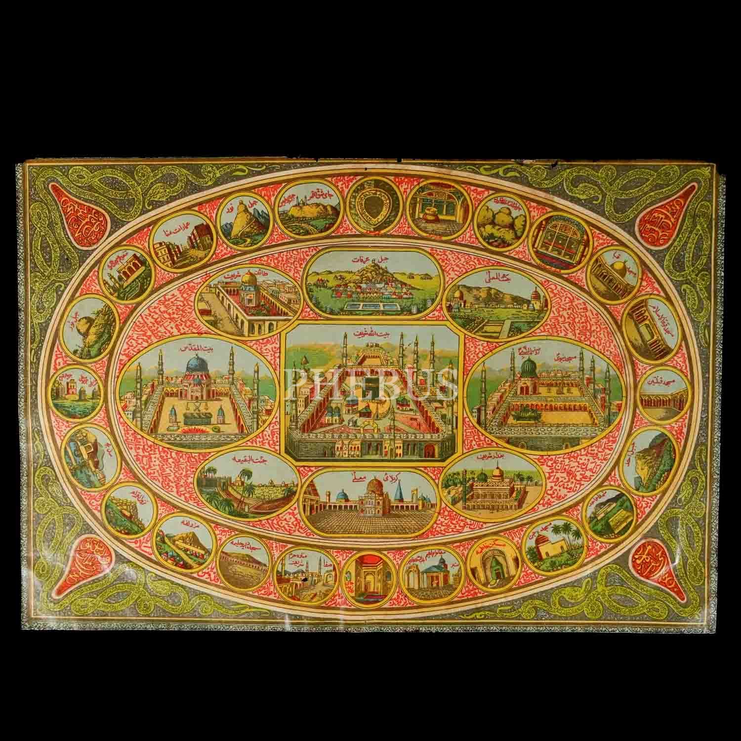 Mescid-i Nebevi Mescid-i Haram ve mukaddes yerler tasvirli poster, görsel aralarında ve kenarlarda gubari tarzında dualar ve ayetler yazılı, 35x23 cm...
