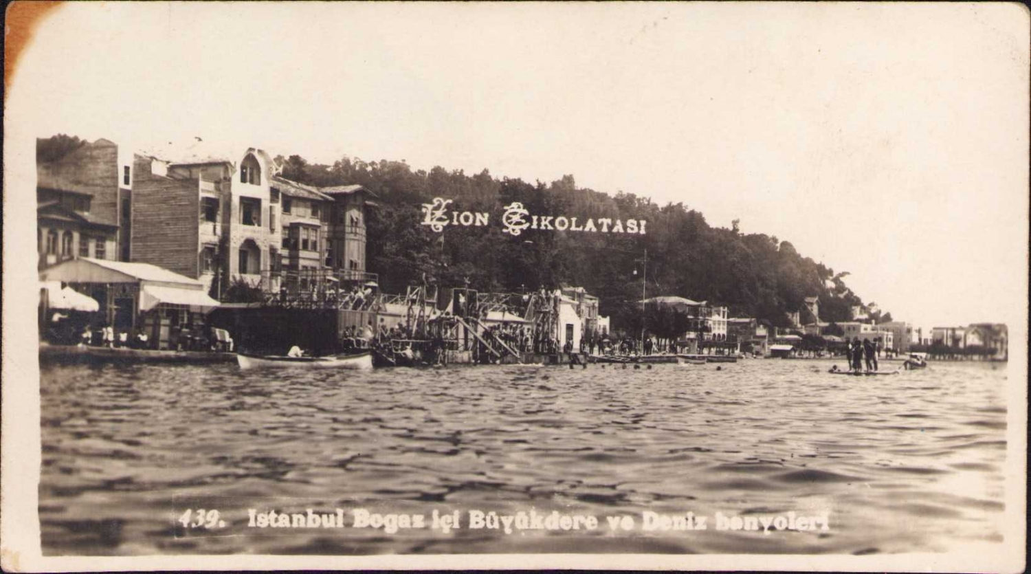 İstanbul Boğaziçi Büyükdere ve Deniz banyoları, Lion Çikolatası damgalı, 13x7 cm