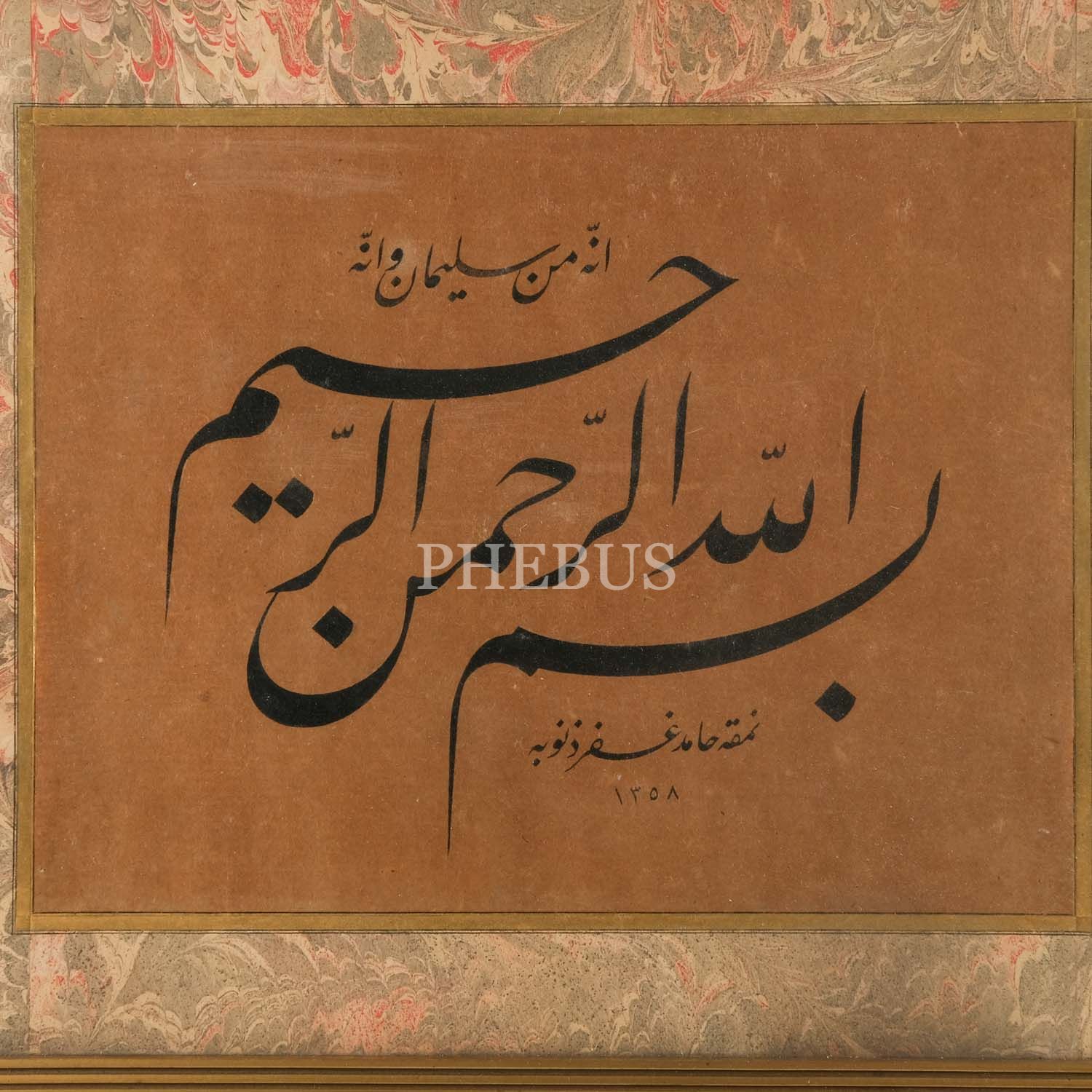 Hamid Aytaç ketebeli talik besmele, 1358 tarihli, yazı ölçü: 24x18 cm, çerçeve ölçü: 44x37 cm...