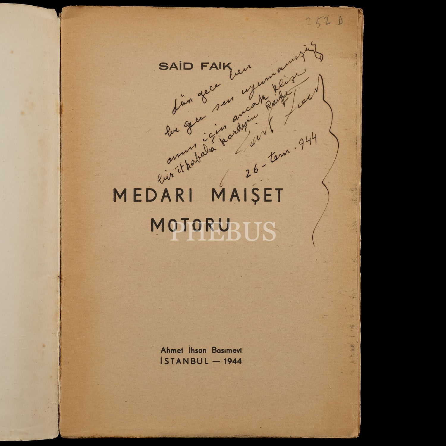 Sait Faik´in, Yeni Mecmua’da tefrika ettiği sırada siyasi otoritelerin dikkatini çekerek sakıncalı damgası yiyen ve bu sebeple bir yayıncı bulmakta zorlandığı ilk roman denemesinin, annesinin maddi desteğiyle yayımlayabildiği nüshası... Yayımlandıktan birkaç gün sonra bakanlar kurulu kararıyla toplatılan kitap 2000 adet basılmış ve toplatılma öncesi sadece 99 nüsha satılabilmişti. Kitabı yayımlayan Yokuş Kitabevi sahibi Burhan Arpad, polisler kitapları toplarken 50 adetlik bir paketi saklayıp evine götürmüş ama daha sonra baskılardan korkarak onları da yakmıştı. Kapağını Agop Arad’ın tasarladığı olaylı kitabın bu son derece nadir nüshası, "Dün gece ben bu gece sen uyumamışız, onun için ancak klişe bir ithafla Kardeşim Raife. Sait Saik. 26 Temmuz 944" ithafıyla imzalıdır.