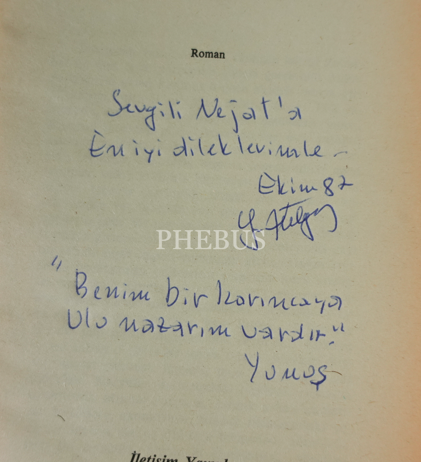 Türk edebiyatının az ama çok öz yazmış büyük yazarı Yusuf Atılgan´ın ikinci romanı... "Sevgili Nejat´a en iyi dileklerimle." ithafıyla Ekim 1987 tarihinde imzalanmış ve Yunus Emre´den bir alıntı düşülmüştür: "Benim bir karıncaya ulu nazarım vardır." Kapak: Mehmet Ak