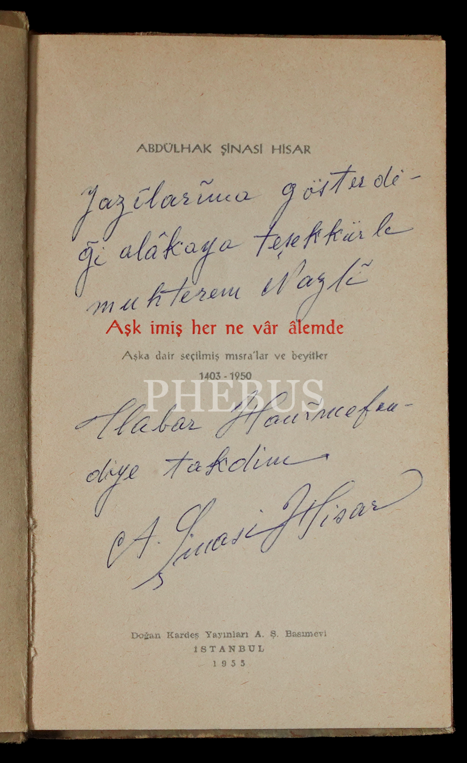 Abdülhak Şinasi Hisar´dan Hatice Nazlı Tlabar´a ithaflı ve imzalı...
