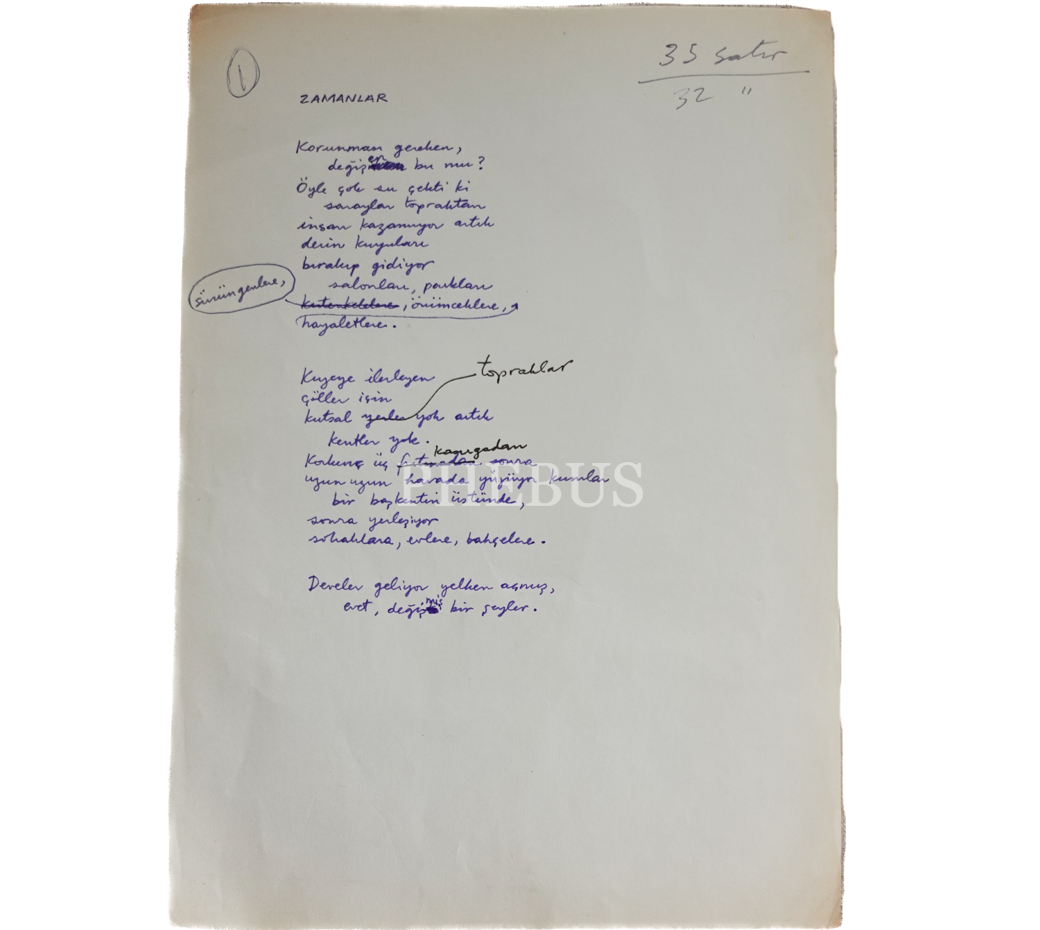 Ülkü Tamer´in el yazısıyla kaleme aldığı, üzerinde birtakım değişikler yaptığı "Zamanlar" şiiri, 21x30 cm...