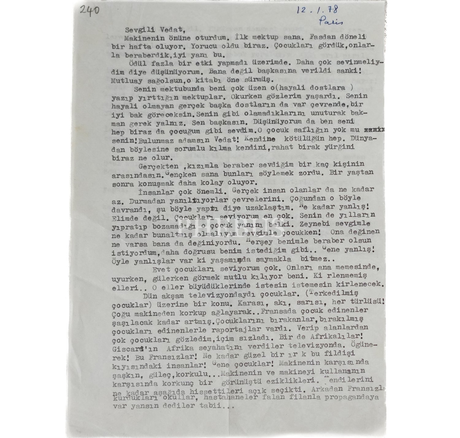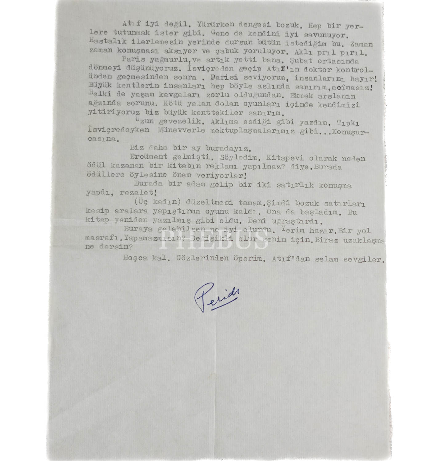 Peride Celal´in, 12 Ocak 1978 tarihinde "Vedat" isimli yakın bir dostuna hitaben kaleme aldığı, çocukların masumiyetinden, eşi Atıf Yönsel sıhhatinin kötüleştiğinden, Üç Kadının Romanı isimli eserinin düzeltmesini tamamladığından bahsettiği ıslak imzalı daktilo mektup, 2 yaprak, 18x25 cm...