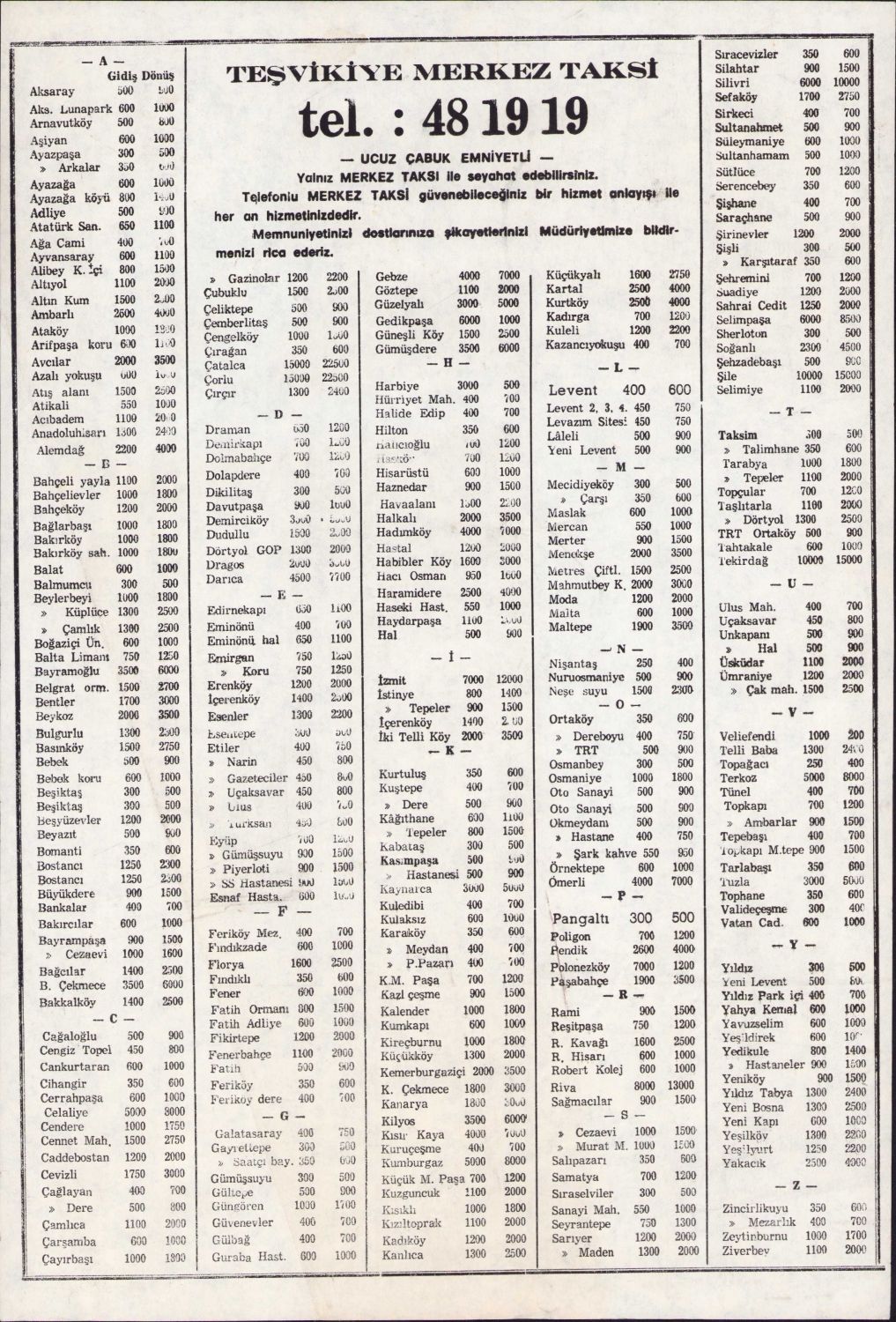 Teşvikiye Merkez Taksi fiyat tarifesi, 22x32 cm