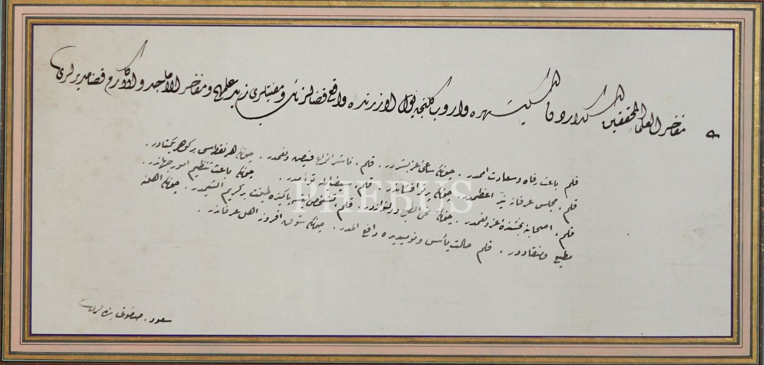 Divani kısımda, Osmanlı resmi evraklarının dili ile yazılmış bir satır meşk edilmiştir. Rika kısımkda kaleme övgüler yazılıdır: "Kalem, bais-i refah ve saadet-i ümemdir..."