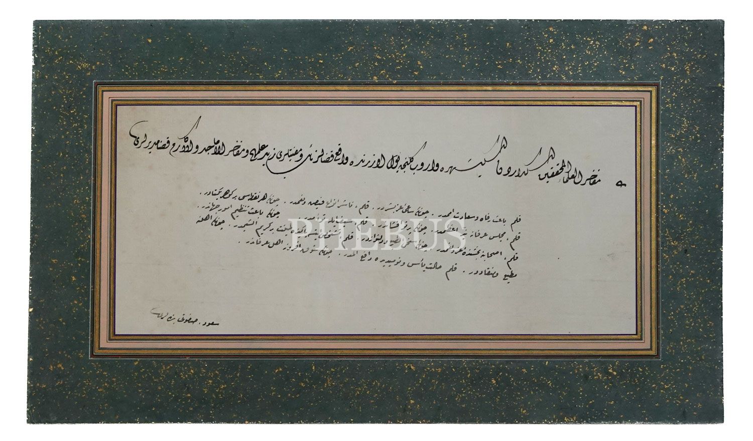 Suud el-Mevlevî´nin "Safvetî" mahlasını kullanarak "Suud Safvetî bendeleri" şeklinde ketebe yazdığı divanî - rik´a meşk, 44x26 cm…