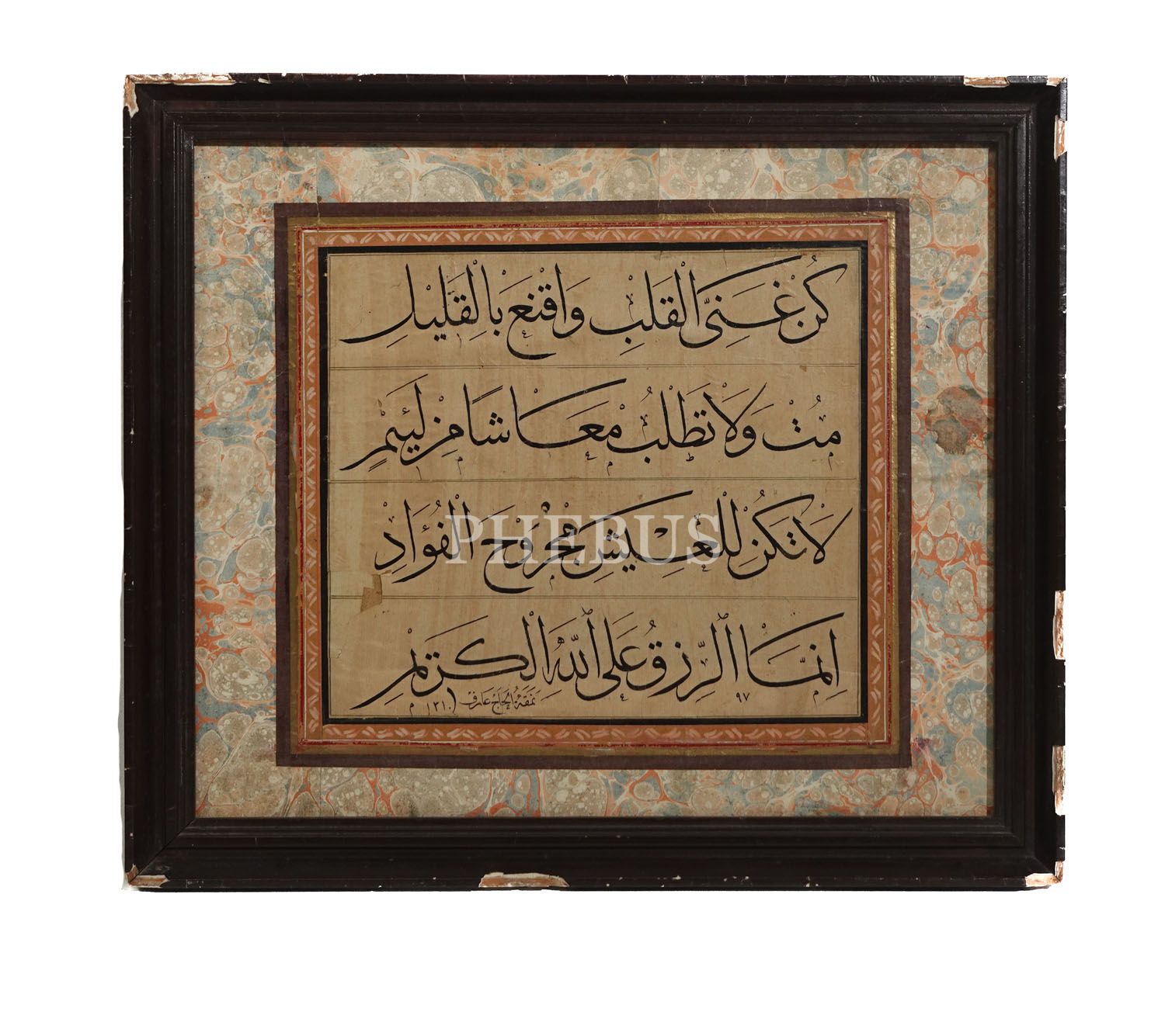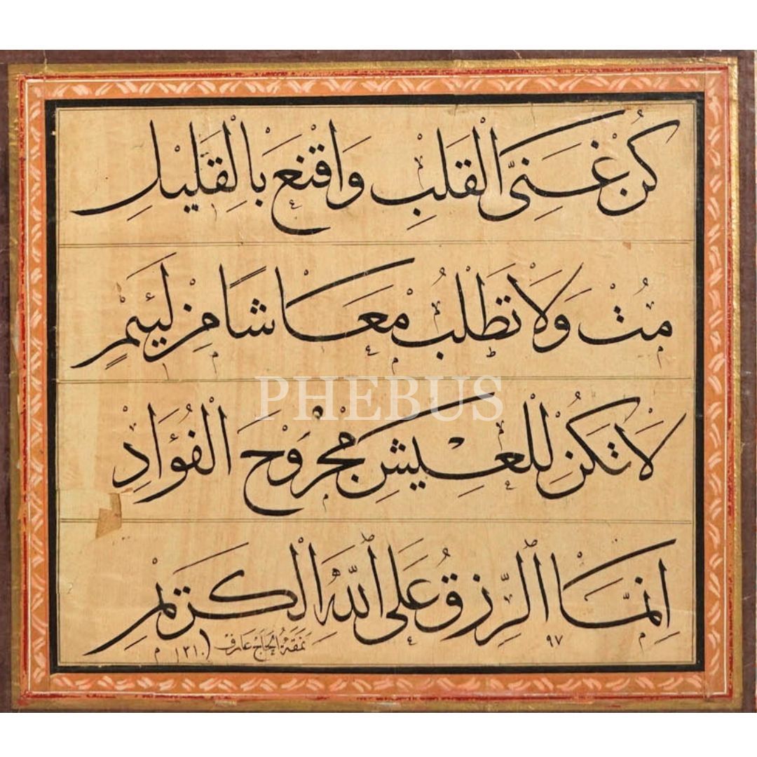 Çarşambalı Arif Efendi ketebeli, kanaatkarlık konulu nasihatler yazılı dört satır sülüs levha, 1310 tarihli, yazı ölçü: 24x21 cm, çerçeve ölçü: 41x35 cm...