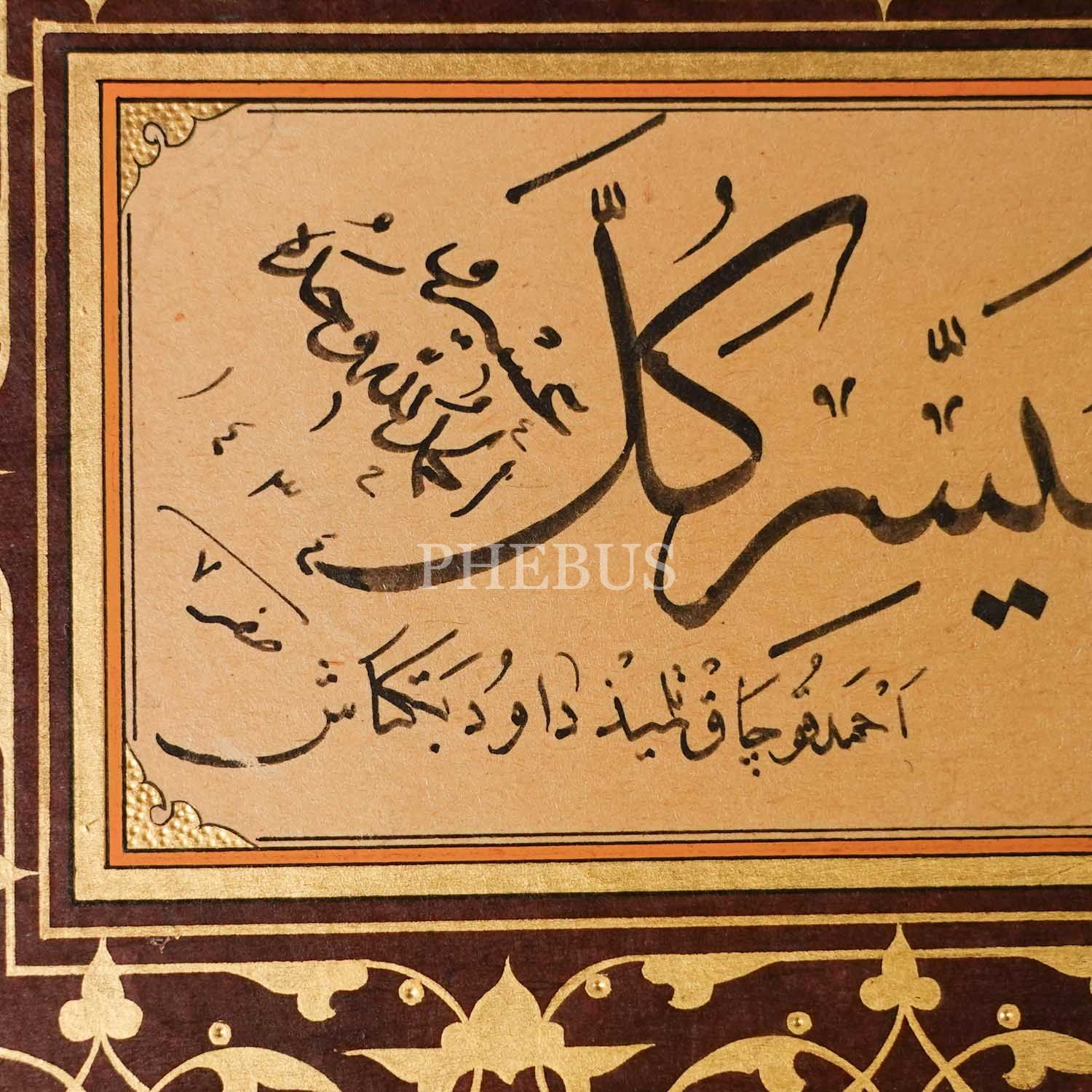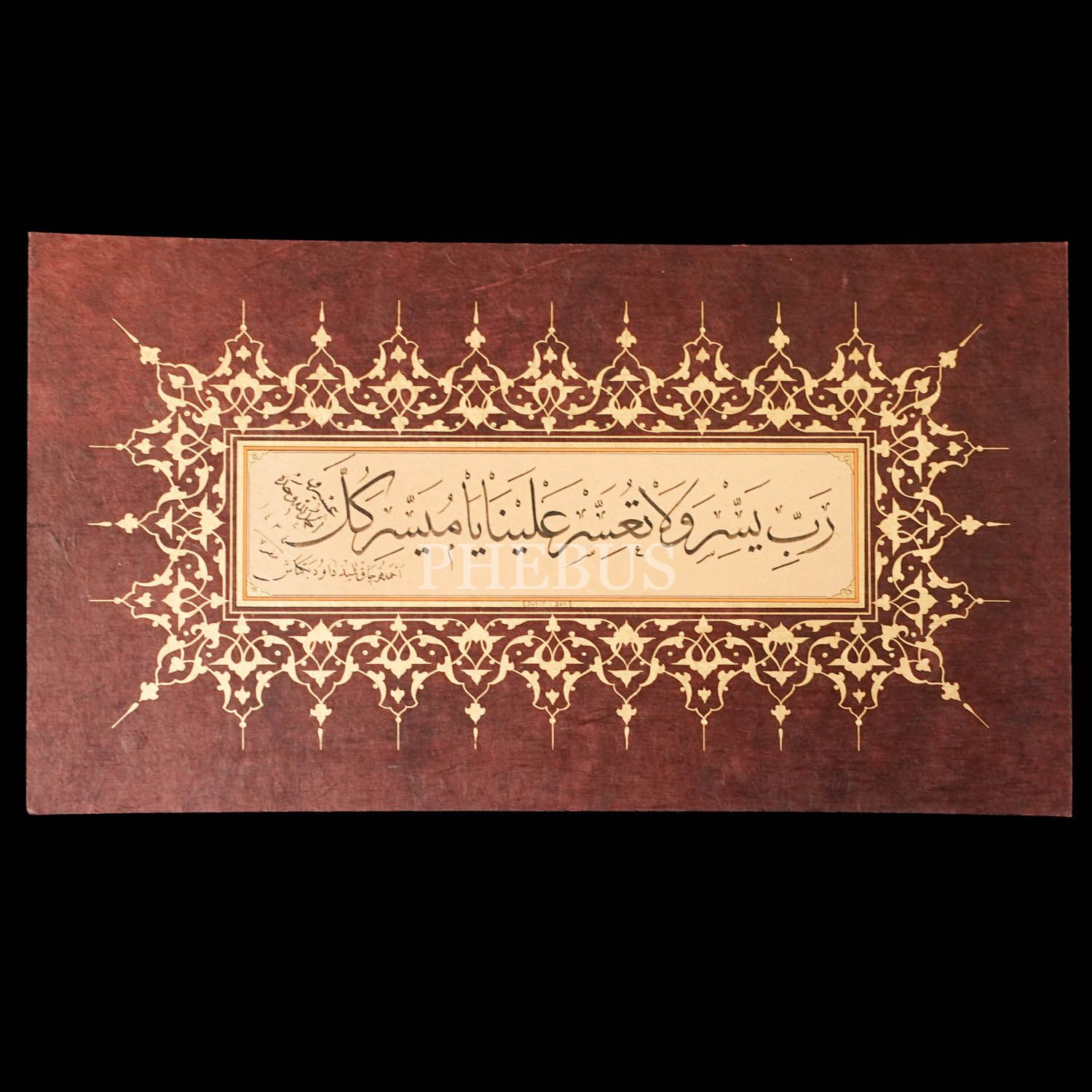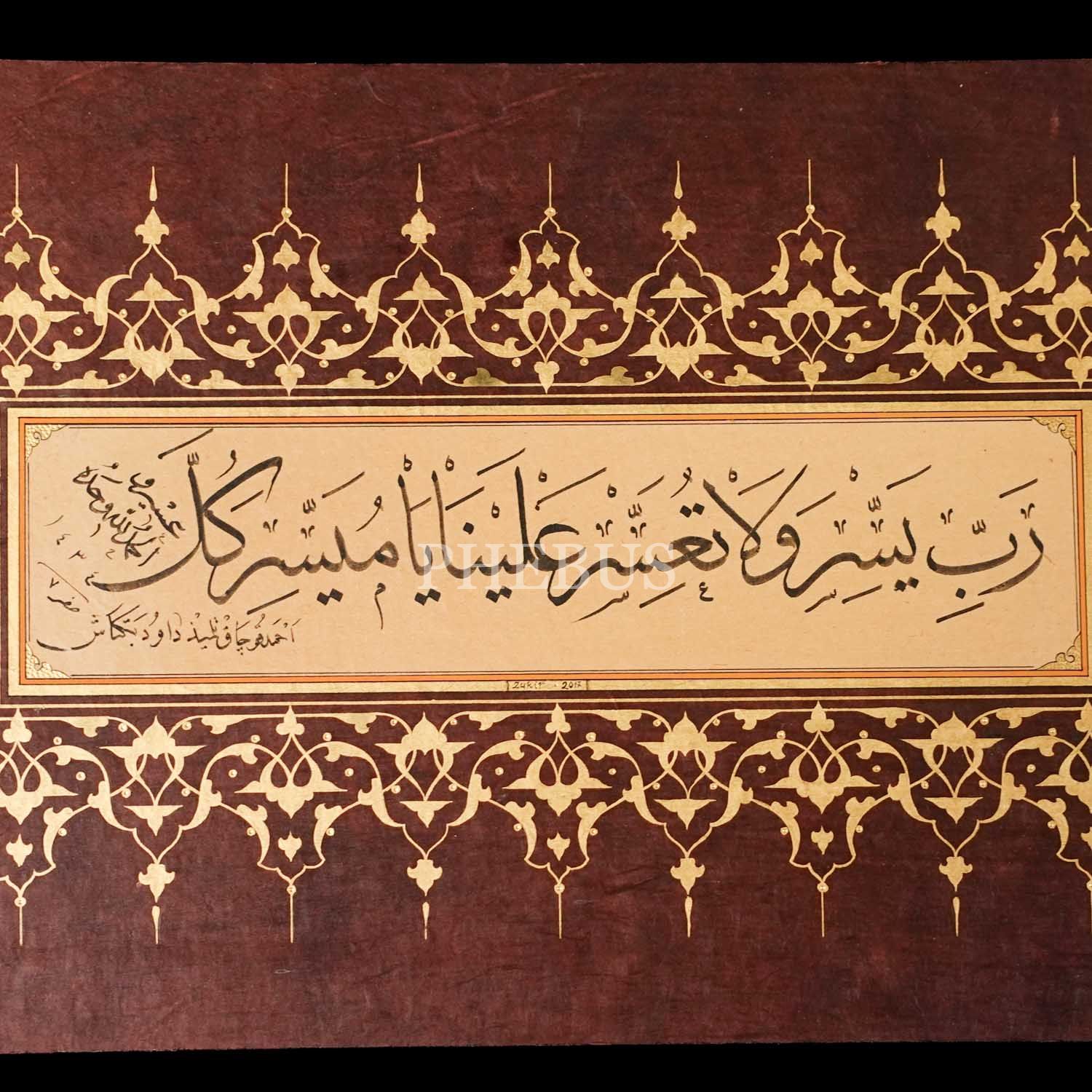 Yazının anlamı: "Rabbim kolaylaştır, zorlaştırma. Ey her zoru kolaylaştıran!" Tezhipteki imza: Zakir (Gökgöz)