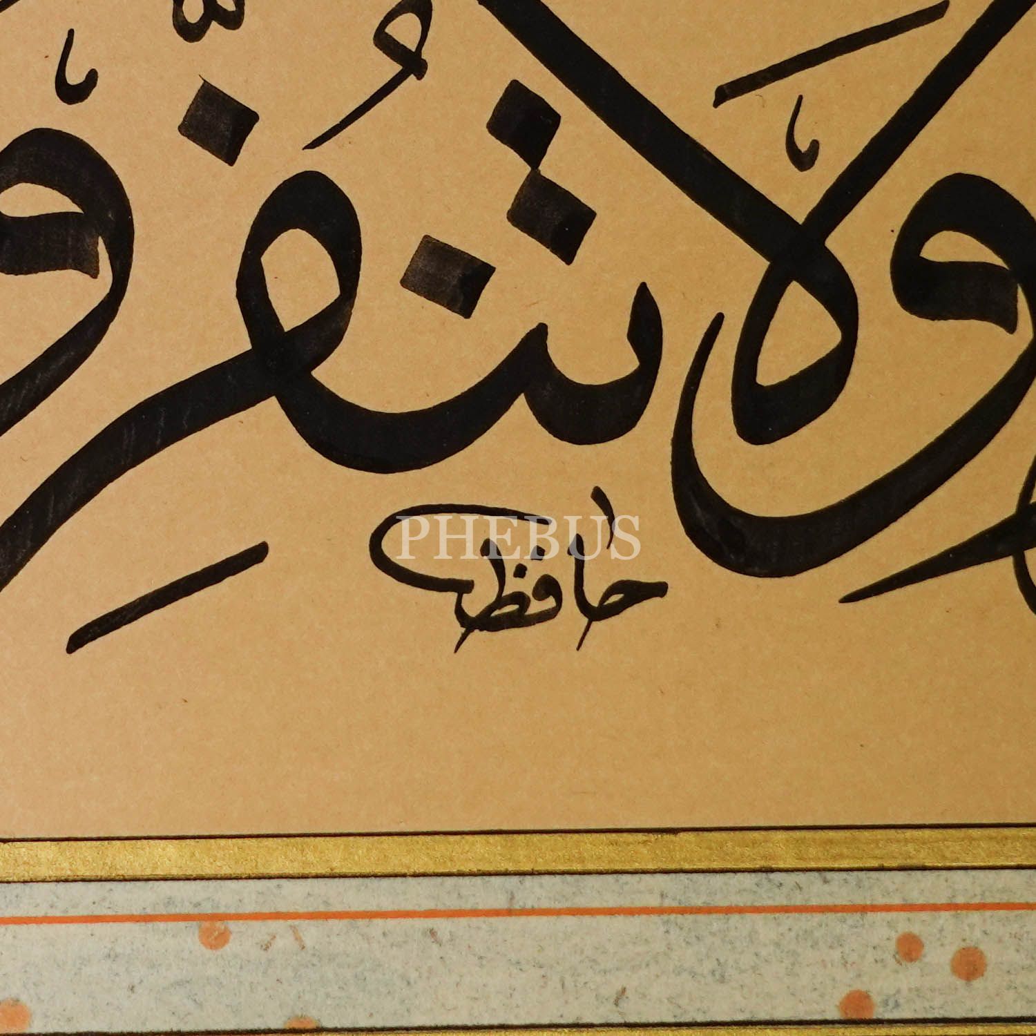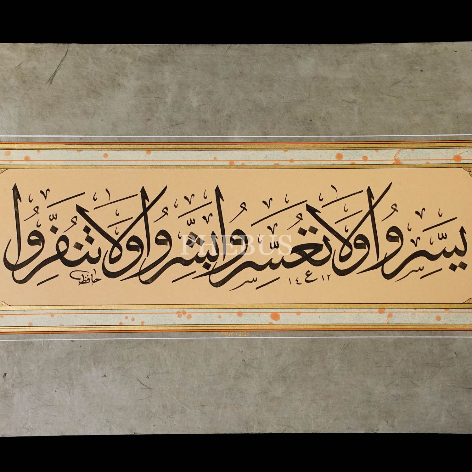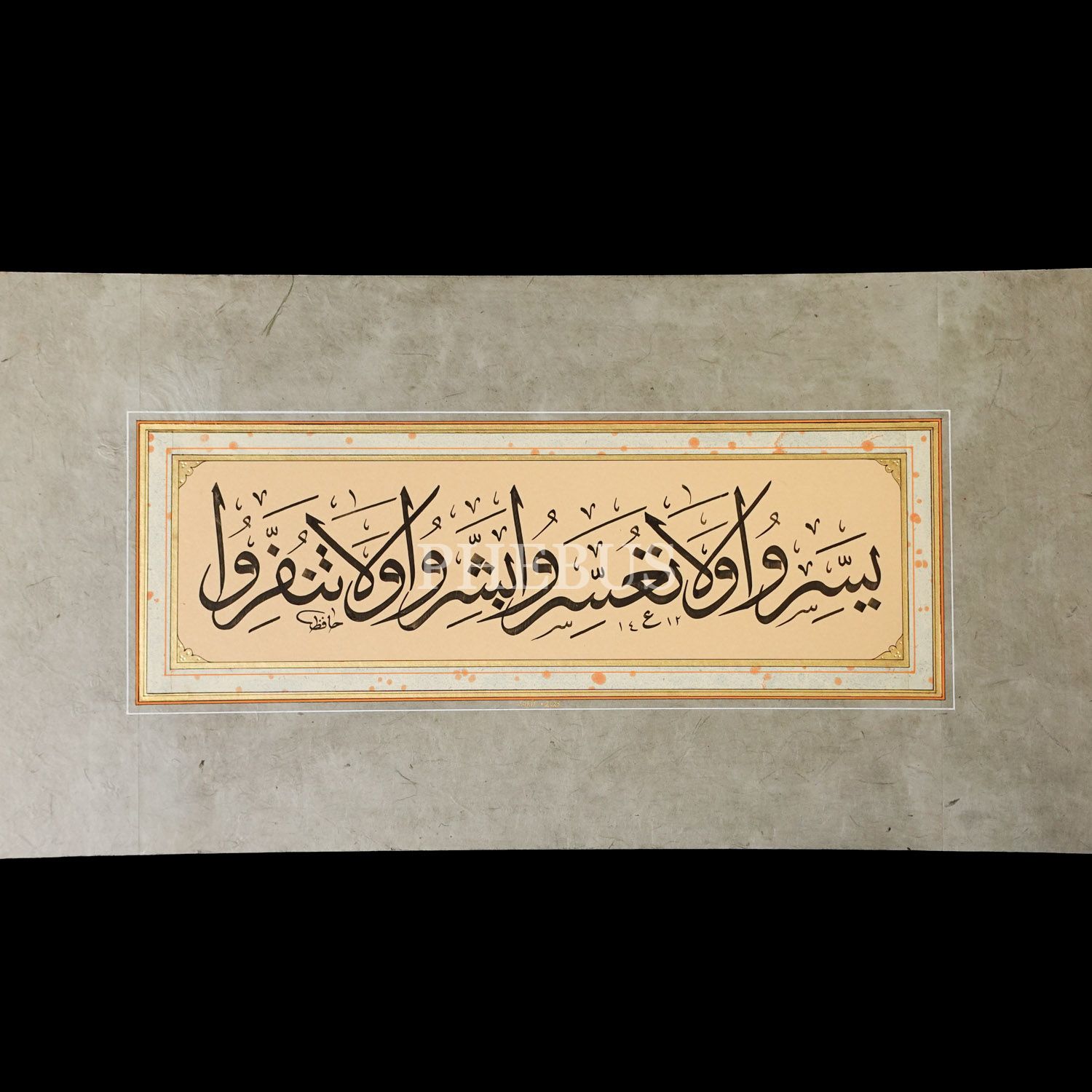 Yazının anlamı: " Kolaylaştırınız, zorlaştırmayınız. Müjdeleyiniz, nefret ettirmeyiniz." anlamına gelen hadis-i şerif yazılıdır. Tezhipteki imza: Zakir (Gökgöz) 2023.