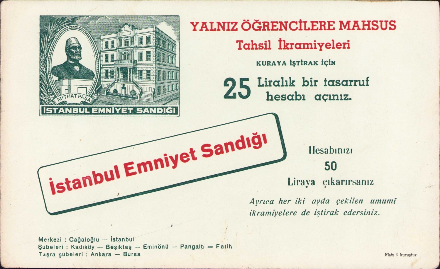 İstanbul Emniyet Sandığı - yalnız öğrencilere mahsus tahsil ikramiyeleri kartı, 23x17 cm