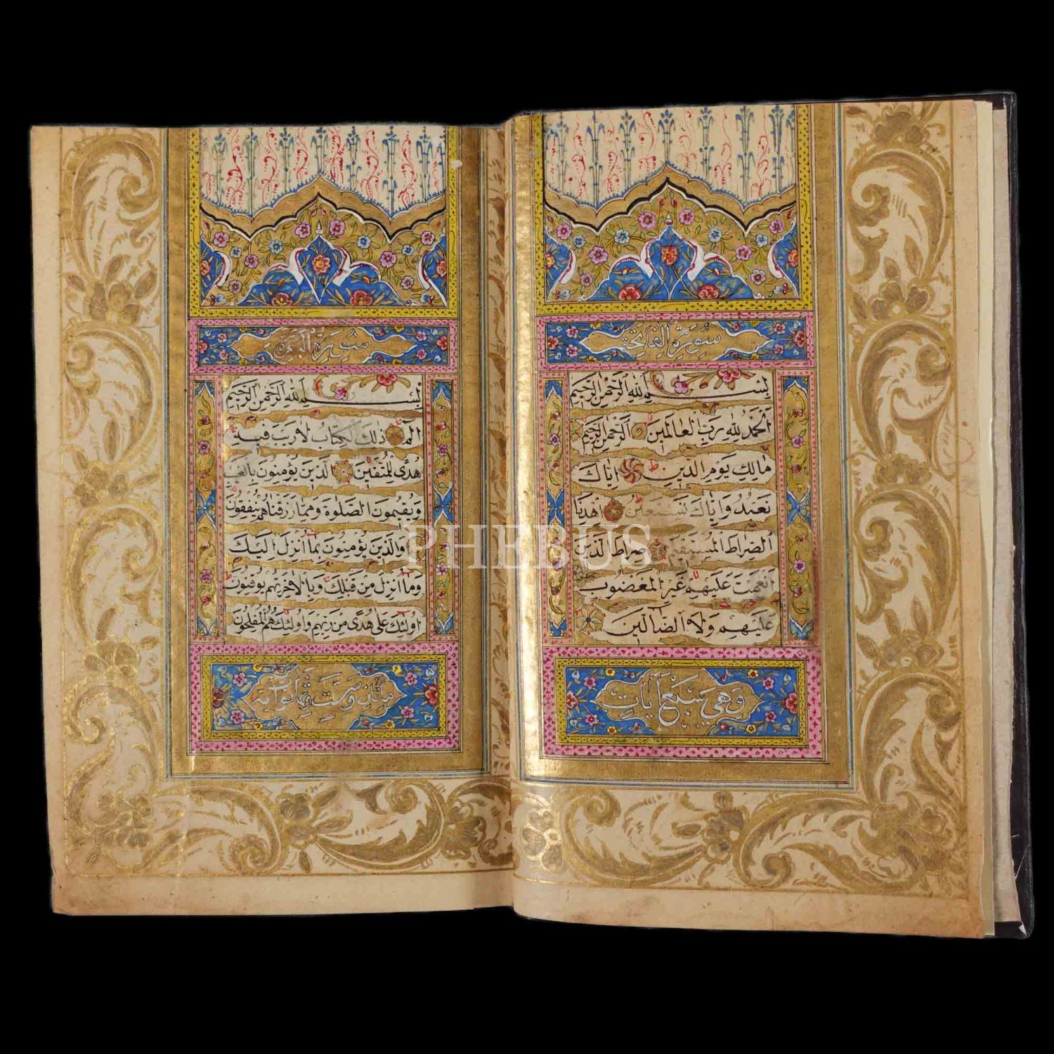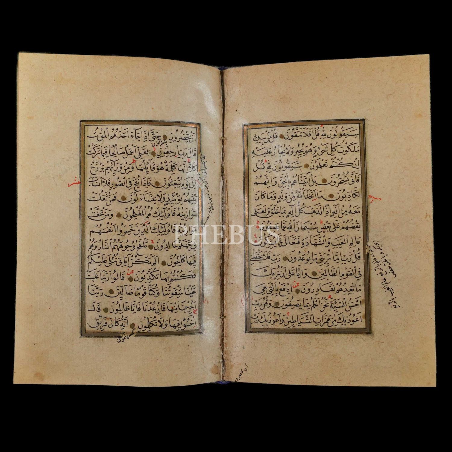 KURAN-I KERİM, serlevhalı, tüm sayfaları tahrirli altın cetvelli, Kuran bittikten sonra 11 sayfalık Arapça-Osmanlıca bir hatim duası yazılmıştır, tamir görmüş dönem cildinde, 18x12 cm...