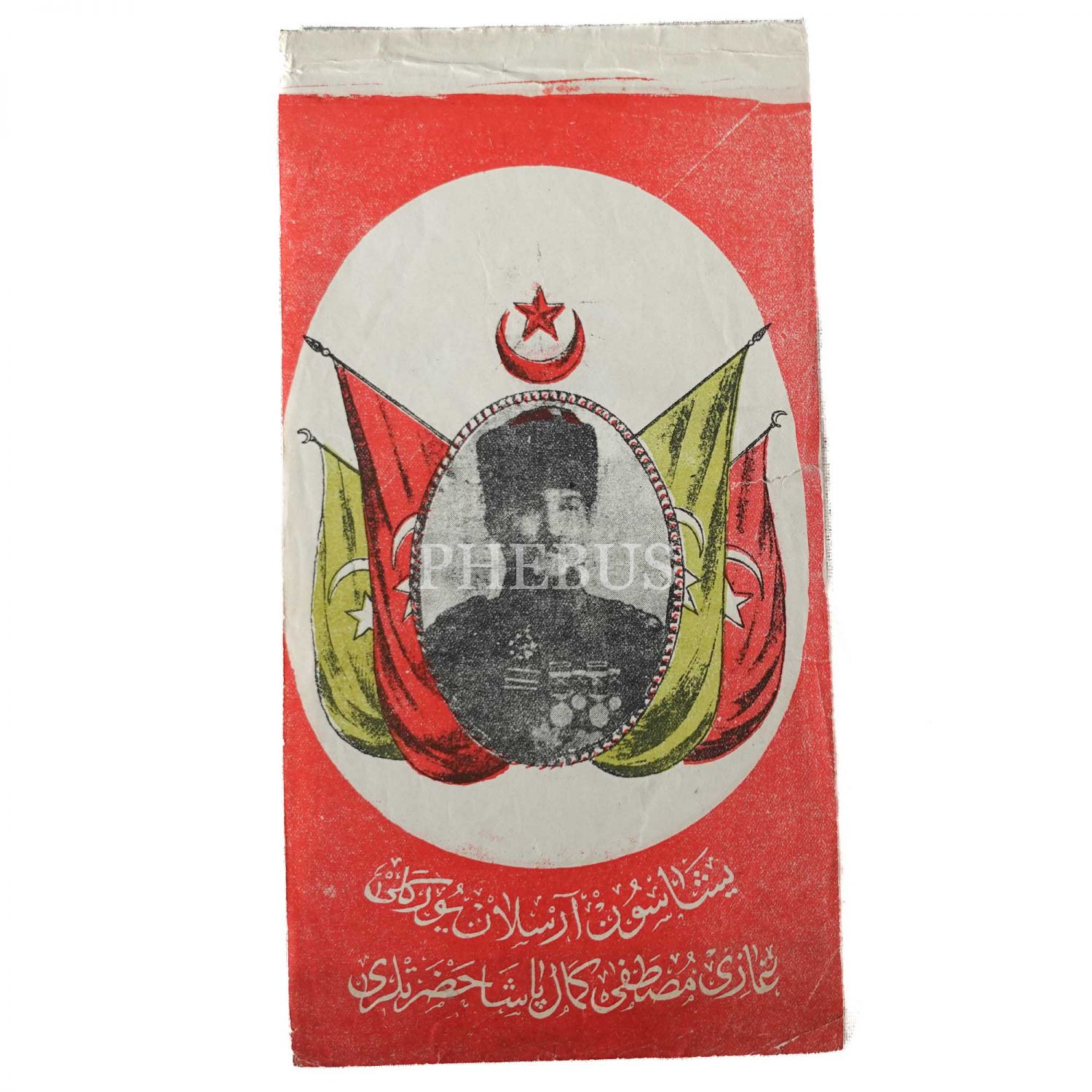 Osmanlıca "Yaşasın Arslan Yürekli Gazi Mustafa Kemal Paşa" yazılı ve kırmızı-yeşil Türk sancakları arasında Mustafa Kemal Atatürk görselli kâğıt bayrak, 13x24 cm...