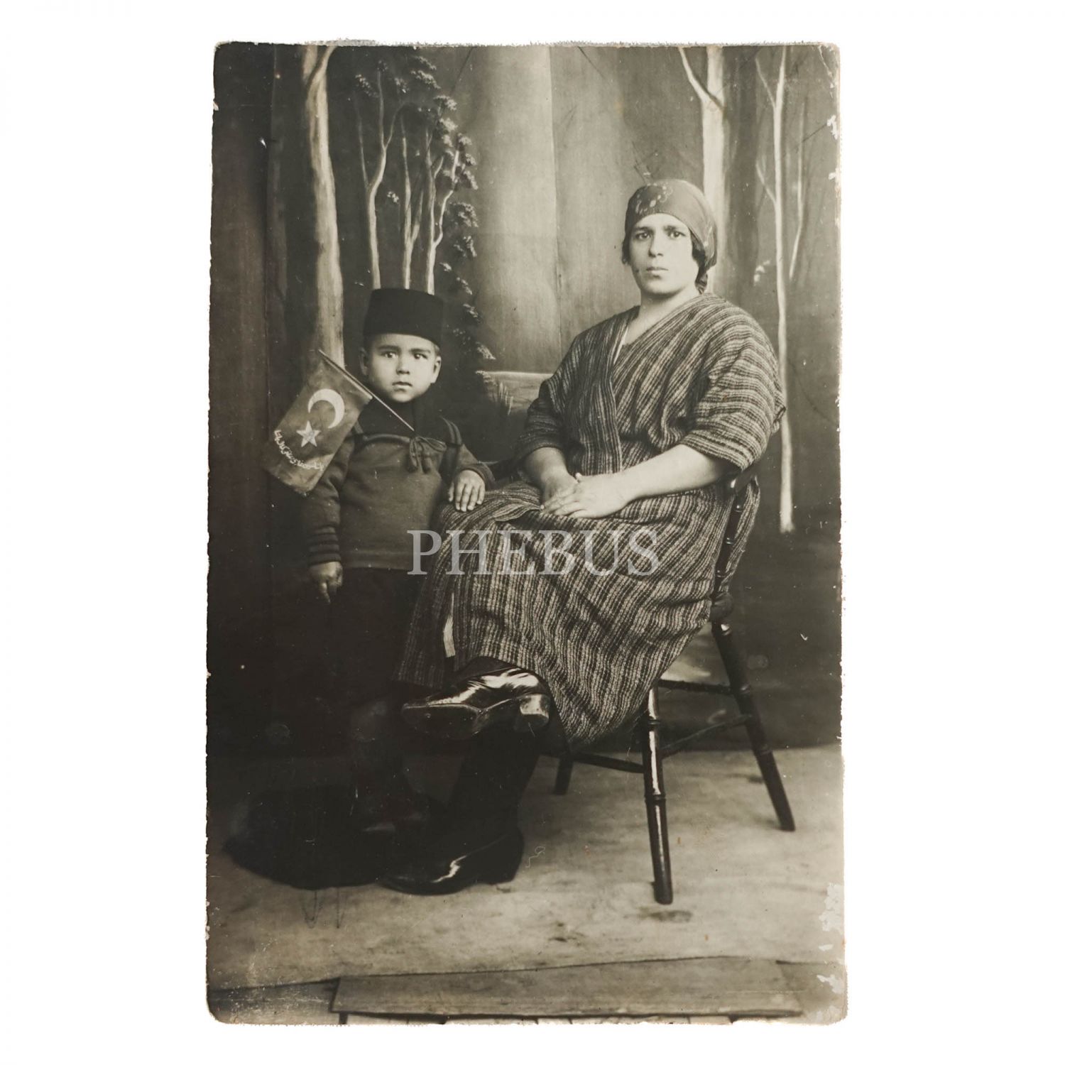 Osmanlıca "Yaşasın Gazi Mustafa Kemal Paşa" yazılı kâğıt Türk bayrağı ve elinde bu bayrağı tutarak poz veren bir çocuğun annesiyle aldırdığı hatıra fotoğrafı, bayrak 11x21 cm, fotoğraf 9x14 cm...