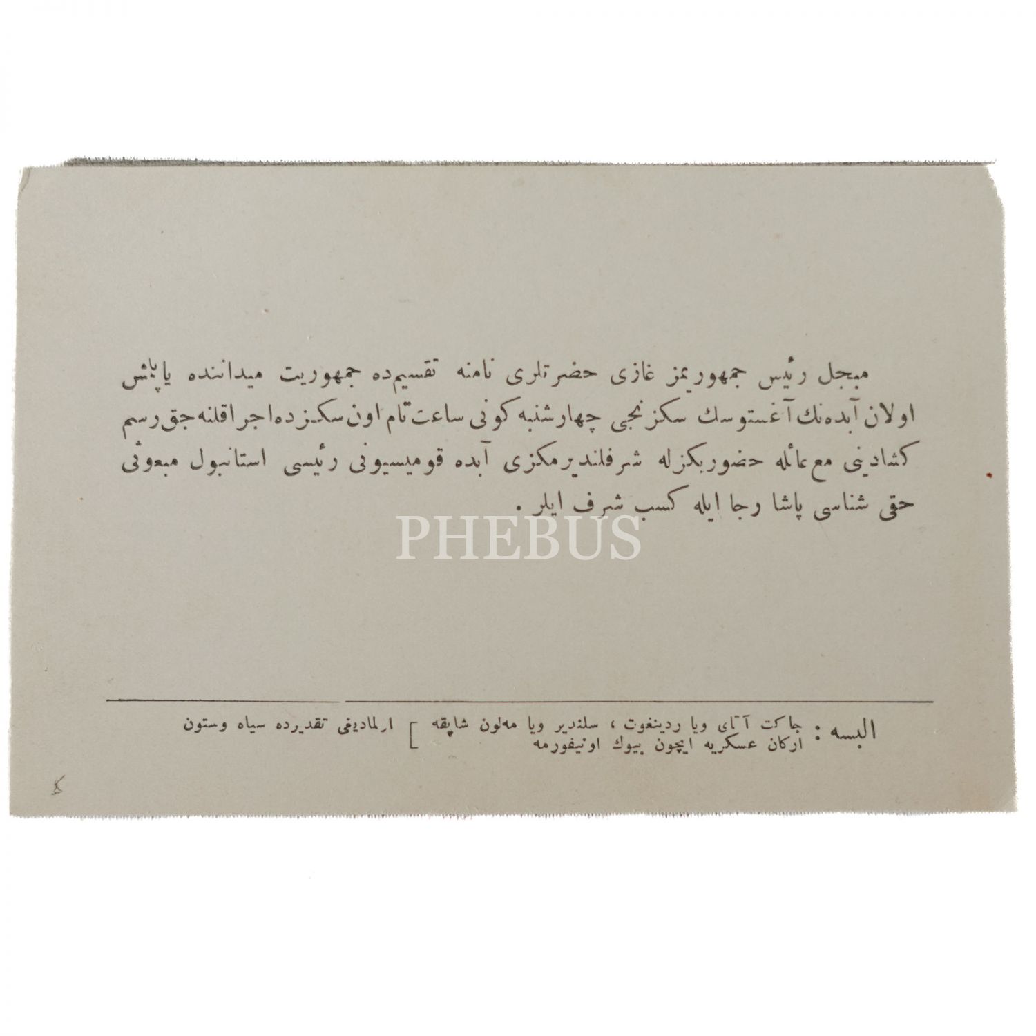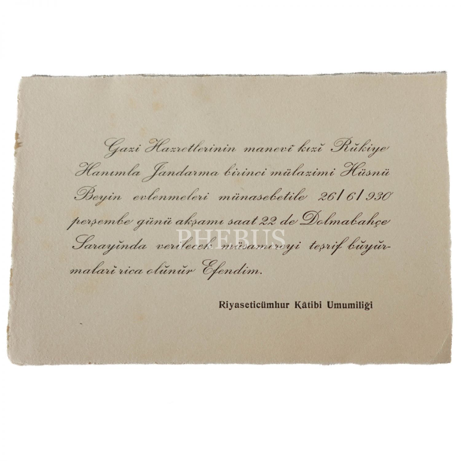 Abide Komisyonu Başkanı Hakkı Şinasi (Erel) Paşa tarafından düzenlenen Taksim Cumhuriyet Abidesi´nin açılış töreni davetiyesi (Osmanlıca, 16x10 cm), Mudanya´yı ziyaret eden Mustafa Kemal Atatürk´e minnet ve şükran arz etmek üzere yola koyulan İstanbullular için hazırlanmış davetiye (Osmanlıca, 14x9 cm) ve Mustafa Kemal Atatürk´ün manevi kızlarından Rukiye Erkin´in, 26 Haziran 1930 tarihinde Dolmabahçe Sarayı´nda gerçekleştirilecek düğün töreninin davetiyesi (Yeni harfli, 17x12 cm)...
