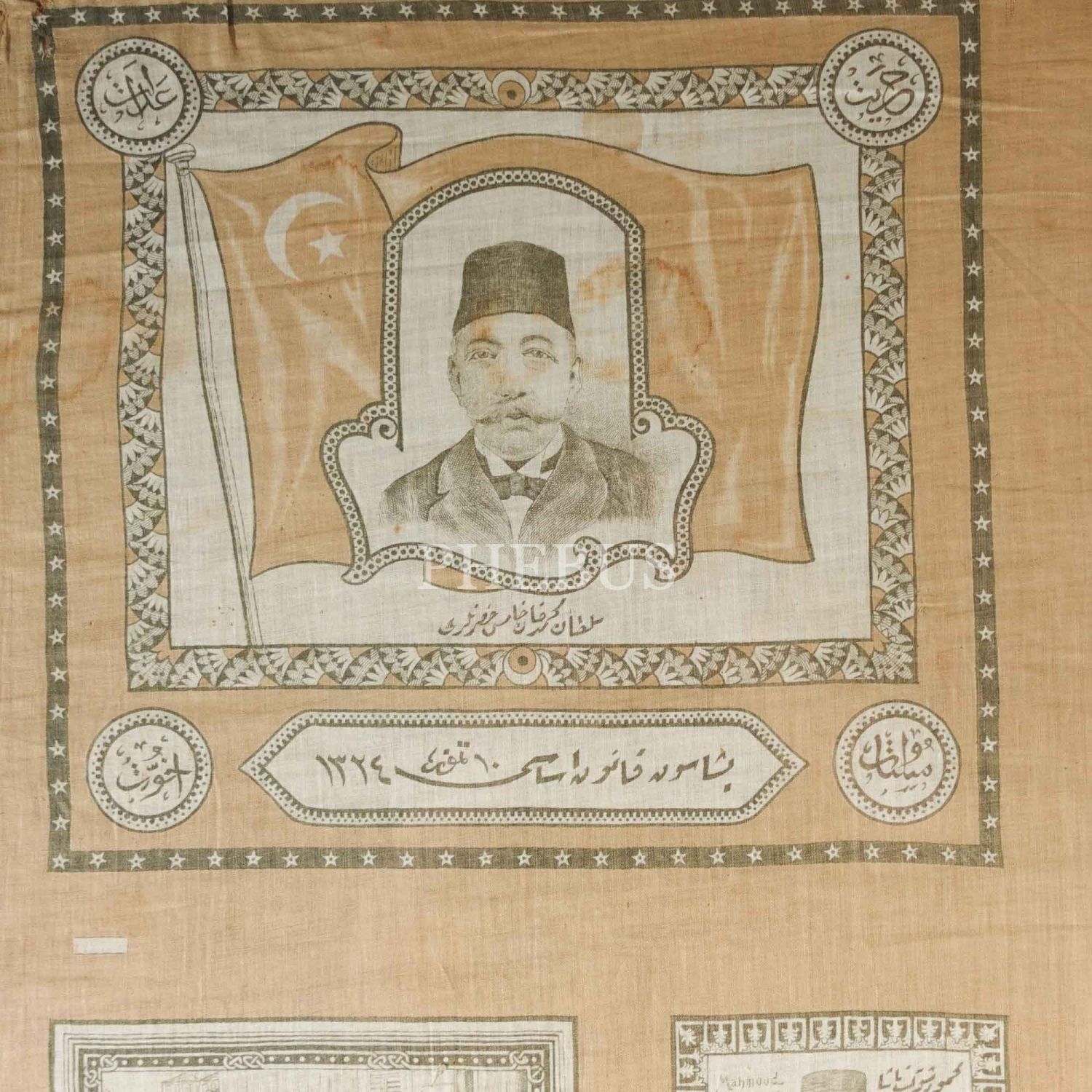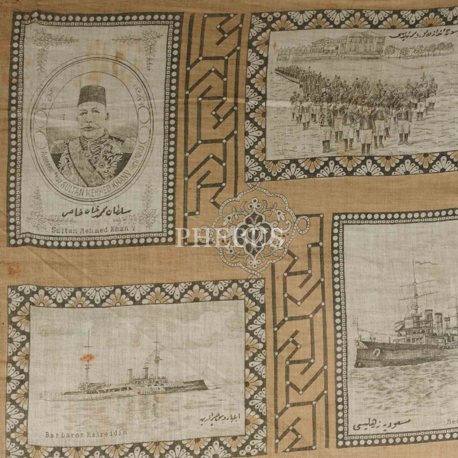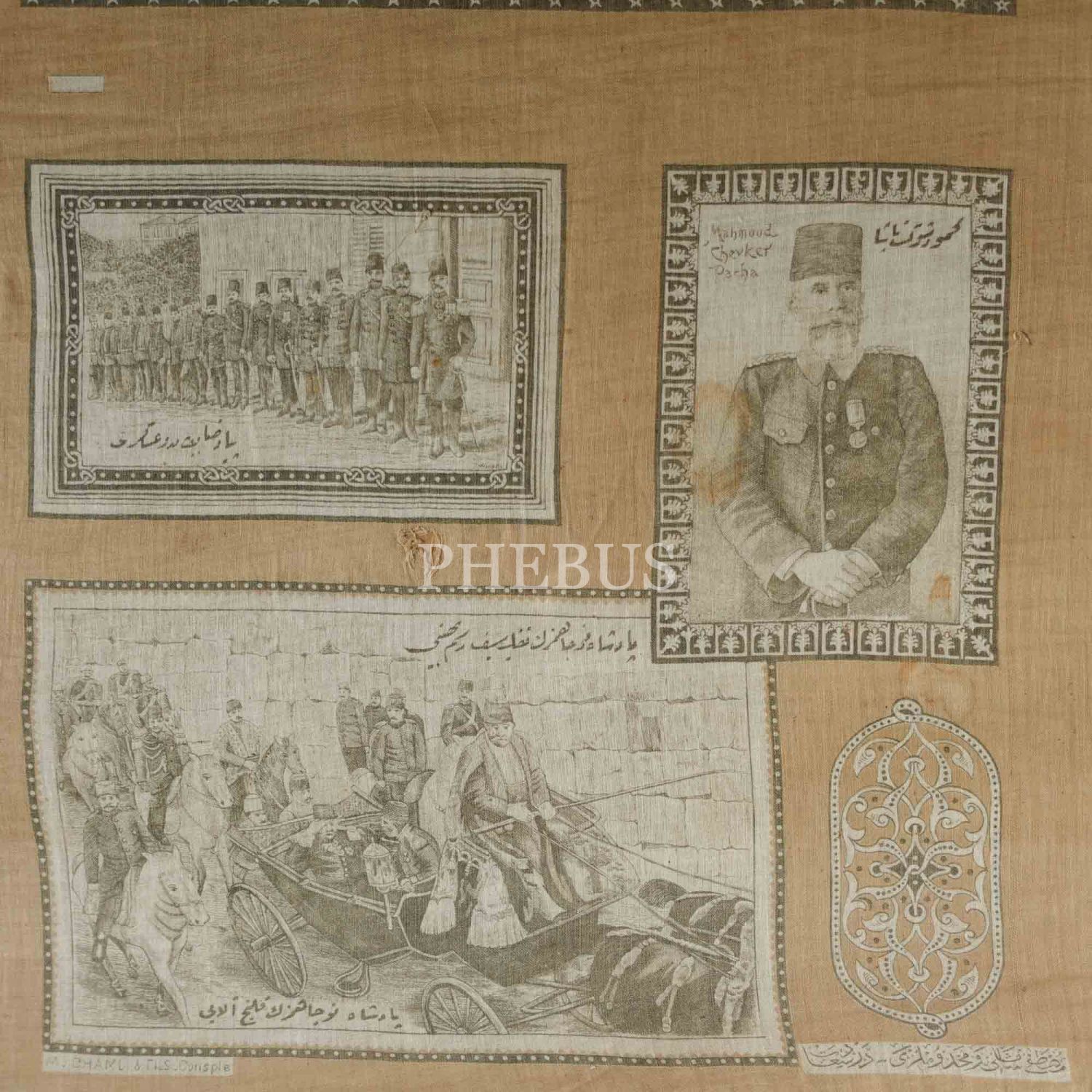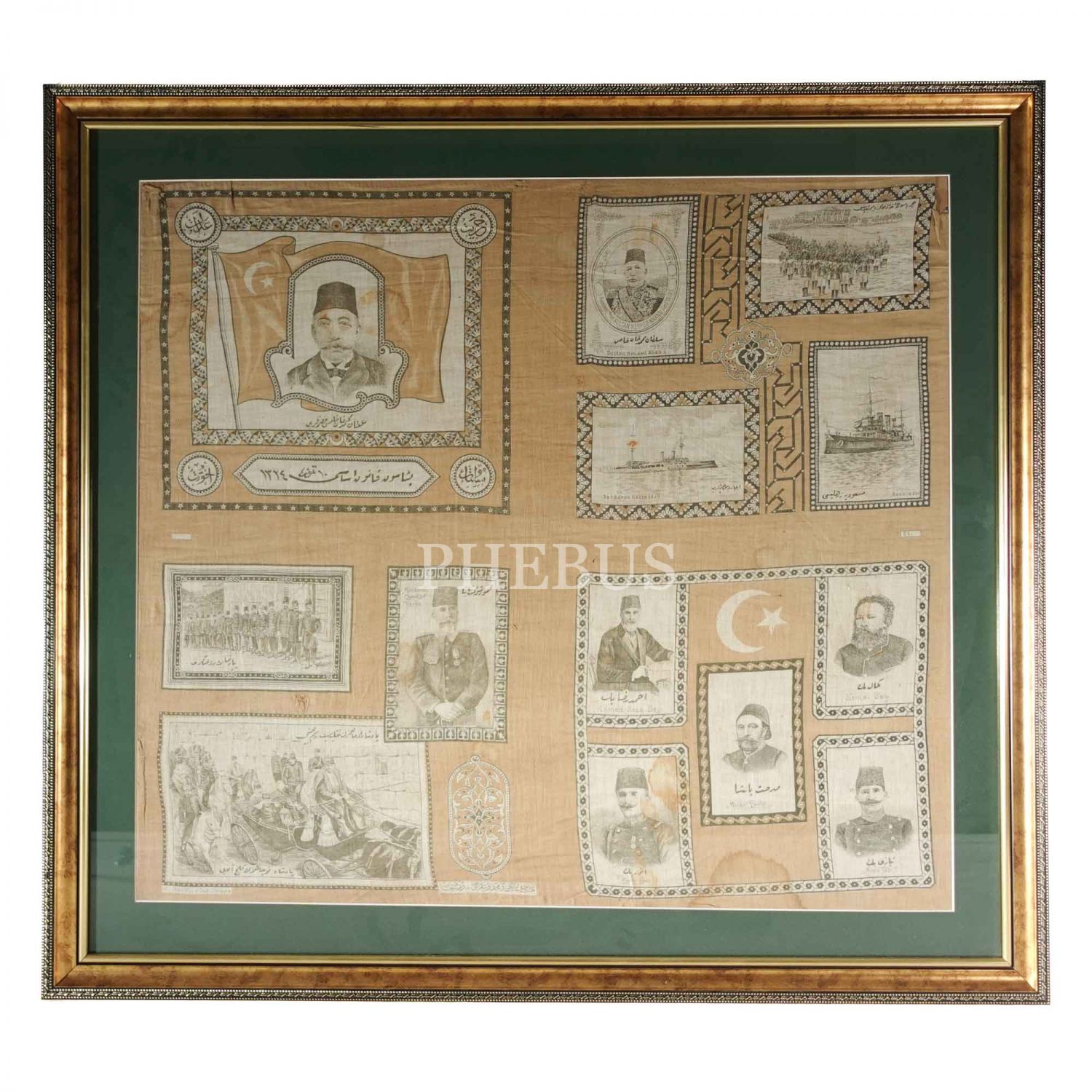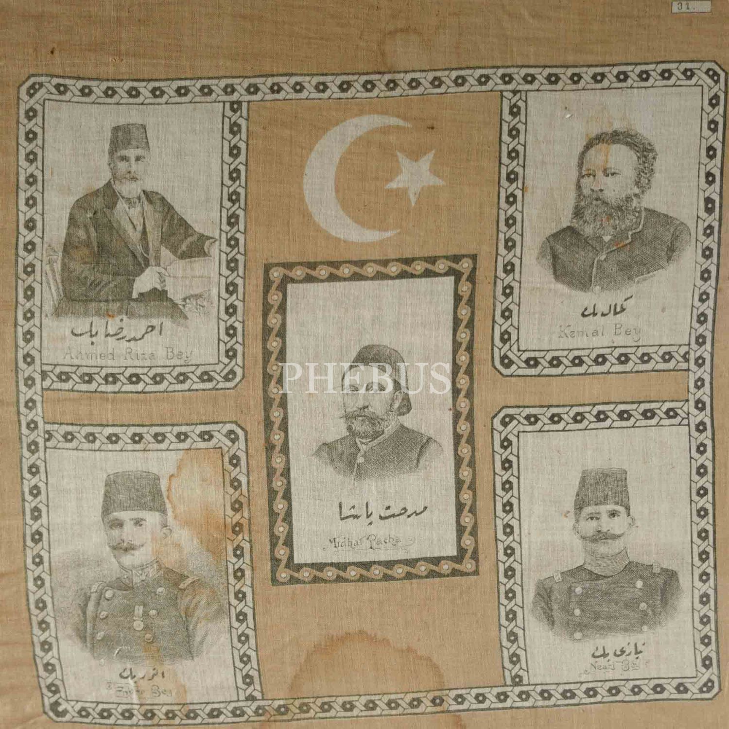İkinci Meşrutiyet döneminden, Sultan Mehmed Reşad´ın ve düşünceleriyle Hürriyet´e giden yolu açan Midhat Paşa, Namık Kemal ve Ahmet Rıza´nın; eylemleriyle Kanun-ı Esasi´nin yeniden yürürlüğe girmesine vesile olan Enver ve Niyazi Beylerle Mahmud Şevket Paşa´nın görsellerinin yer aldığı dev boy ipek mendil, mendil 74x66 cm, çerçeve 91x83 cm...