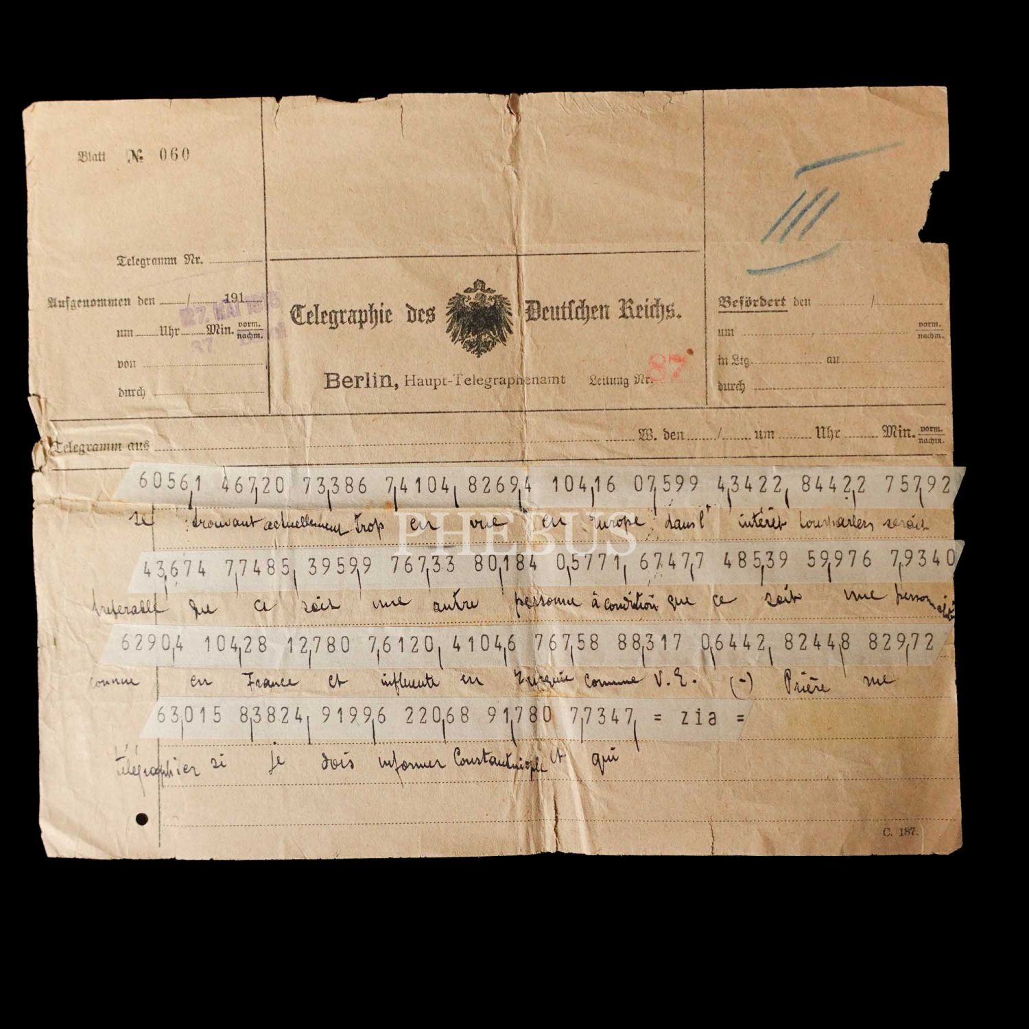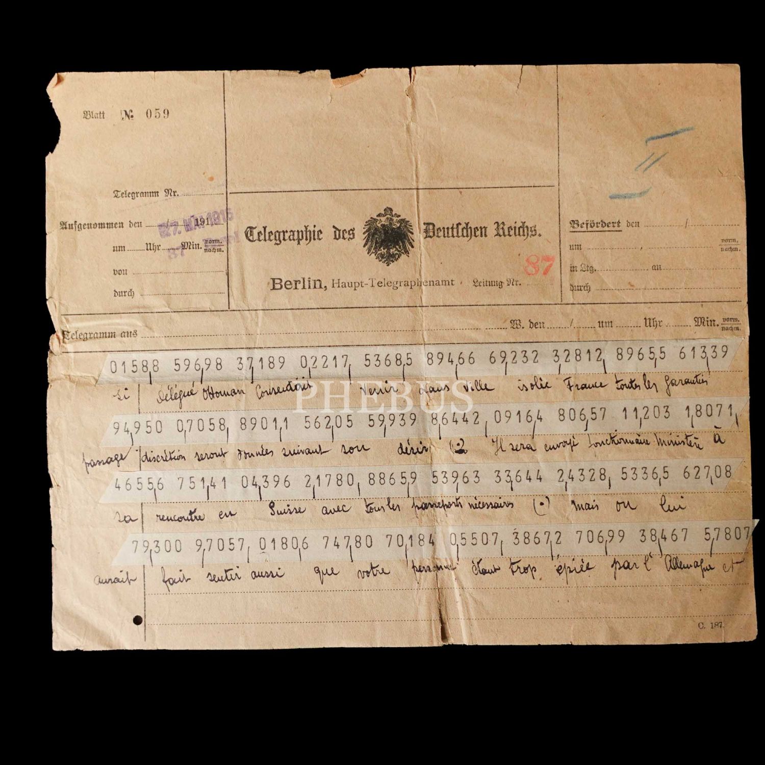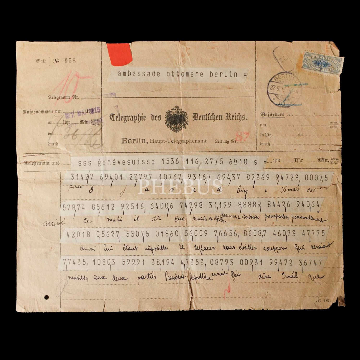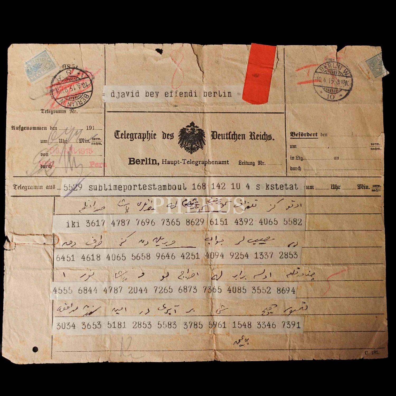 Dahiliye Nazırı Talat Paşa tarafından Maliye Nazırı Cavid Bey´e, İstanbul´dan Berlin´e 10 Nisan 1915 tarihinde gönderilmiş olan şifreli üç parça telgraftan birinde Enver Paşa´nın Çanakkale müdafaasından emin olduğu bildirilmekte, bir diğerinde ise Almanlarla imza edilecek mukavele ile alakalı özet bilgiler ibraz edilmektedir. Cihan Harbi´nin bütün cephelerde sürdüğü ve Çanakkale Savaşı´nın olanca ateşiyle Osmanlı Devleti´ni sarstığı bir tarihte, Ermeni tehcirinin hemen arifesinde devletin çok önemli iki bakanı arasında yapılmış olan bu şifreli muhaberatın ne kadar önem arz ettiği tahmin edilebilir. Bunların yanı sıra lot içerisinde "Omer Farouk" (Şehzade Ömer Faruk Efendi?), "Cherif" (Şerif), "Zia" (Ziya) ve "İsmail" (İsmail Canbulat? İsmail Enver?) tarafından gönderilmiş, tahminden öteye varan sağlıklı kimlik tespiti için etüde muhtaç telgraflar da mevcuttur.